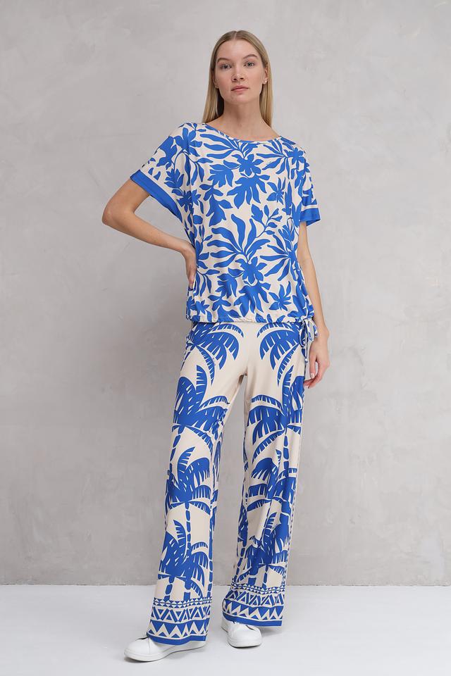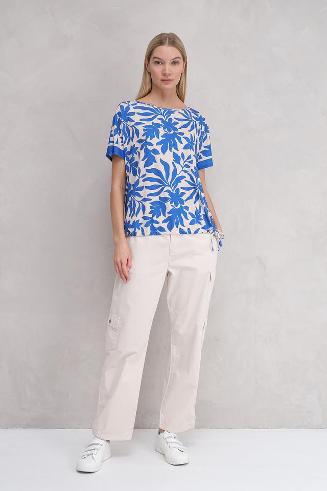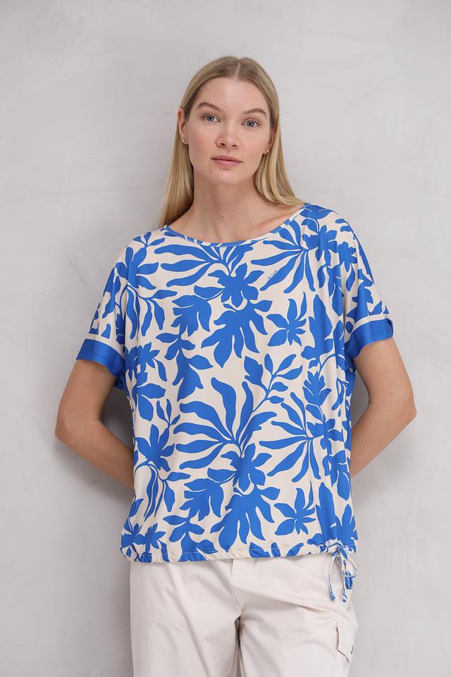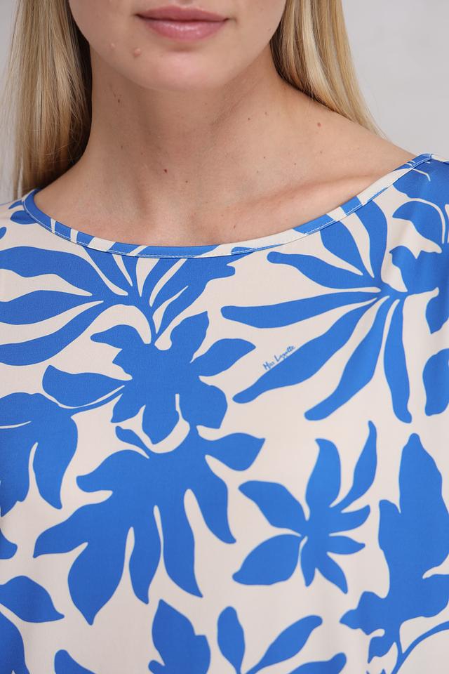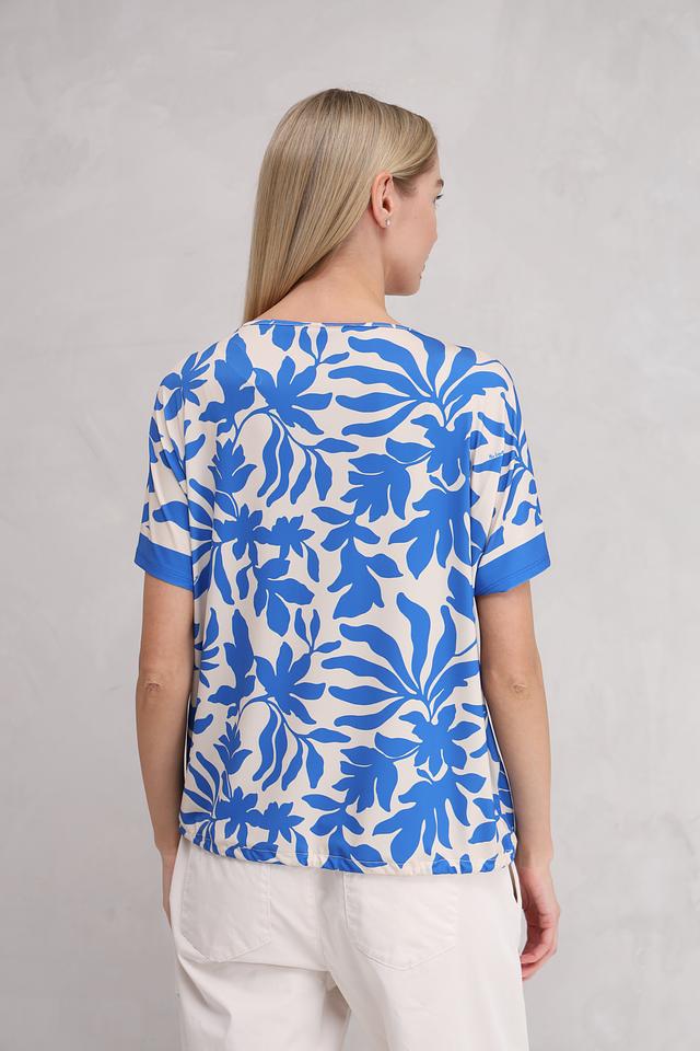 Блуза Miss Lagotte синего цвета с ярким цветочным принтом станет отличным дополнением к вашему гардеробу. Модель выполнена из лёгкой ткани с добавлением эластана, что обеспечивает комфорт и свободу движений. Блуза имеет короткие рукава и округлый вырез горловины. Состав: полиэстер 92%, эластан 8%