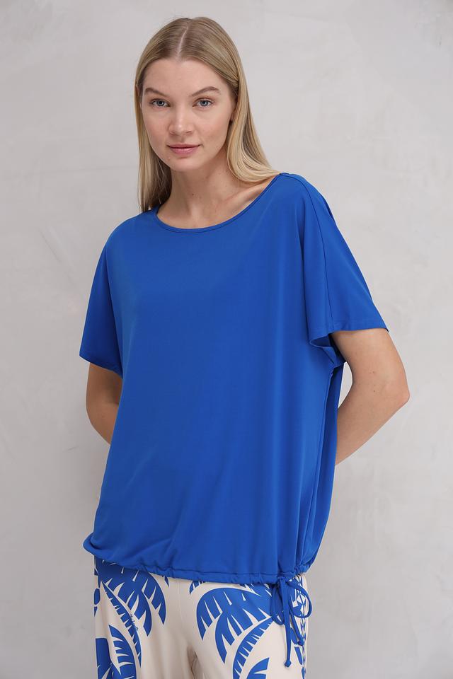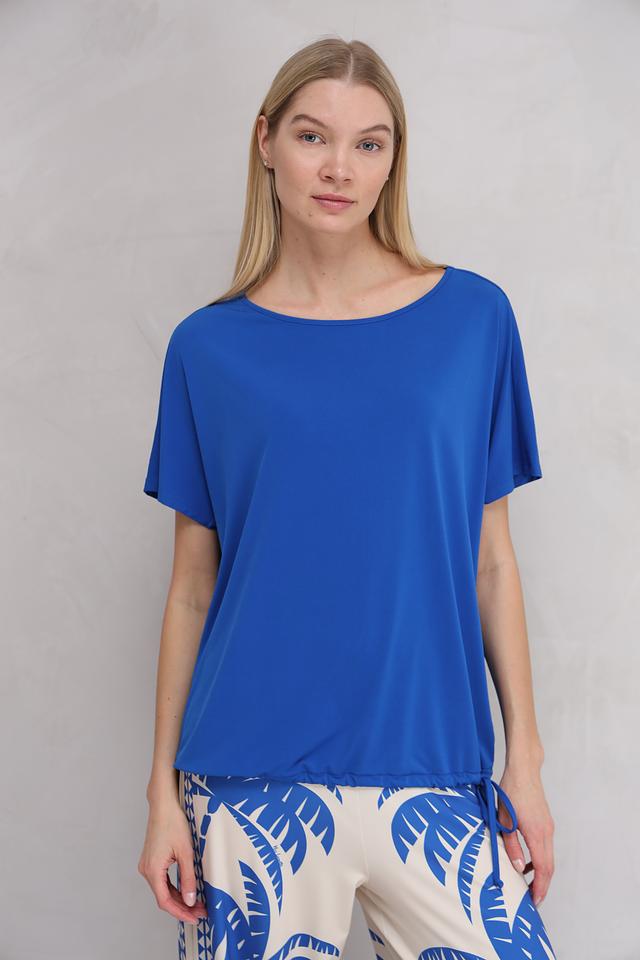 Блуза имеет округлый вырез горловины и короткие рукава, что делает ее идеальным выбором для теплой погоды. Сбоку блуза оснащена шнурком для регулировки объема. Модель изготовлена из полиэстера с добавлением эластана, что обеспечивает приятные тактильные ощущения и легкий уход.