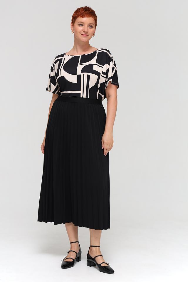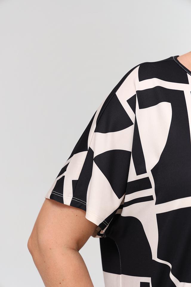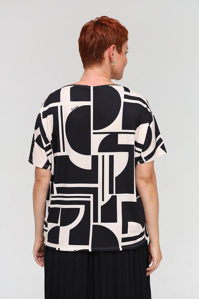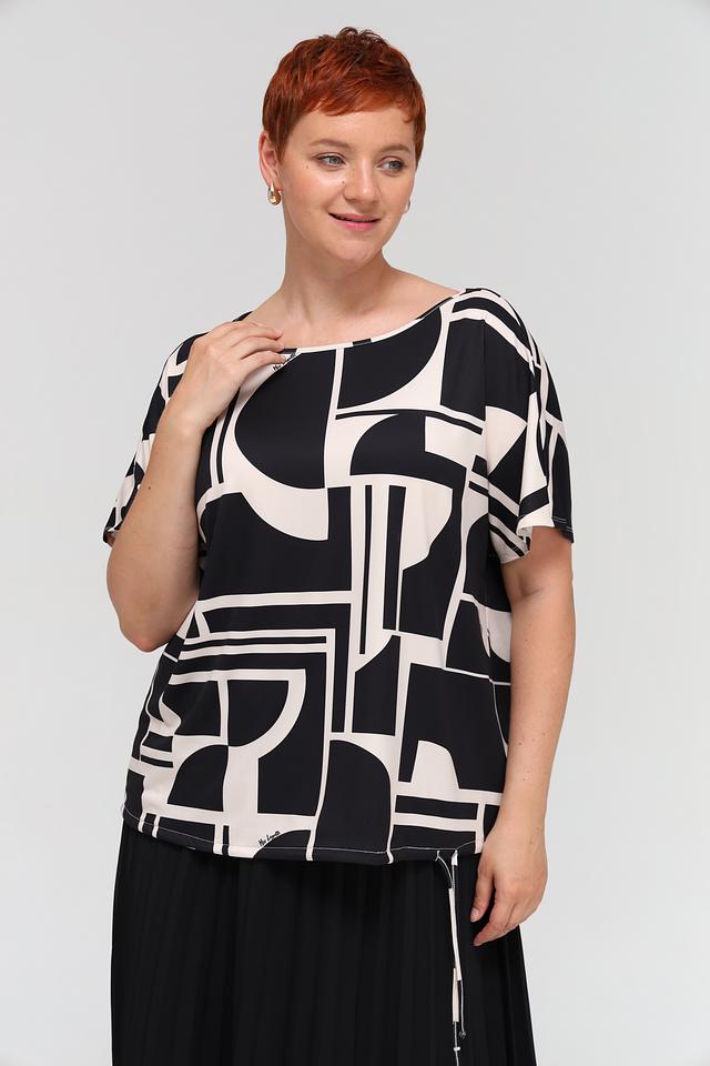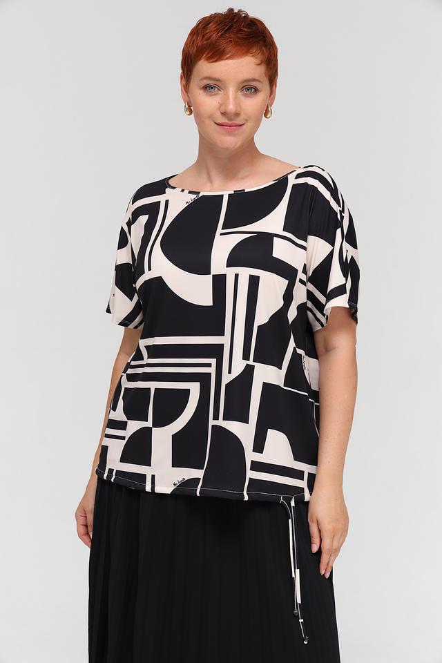 Блуза Miss Lagotte чёрно-белого цвета с оригинальным геометрическим принтом станет стильным дополнением к вашему гардеробу. Модель свободного кроя с короткими рукавами обеспечивает комфорт и свободу движений. Состав: полиэстер 92%, эластан 8%
