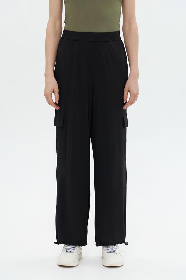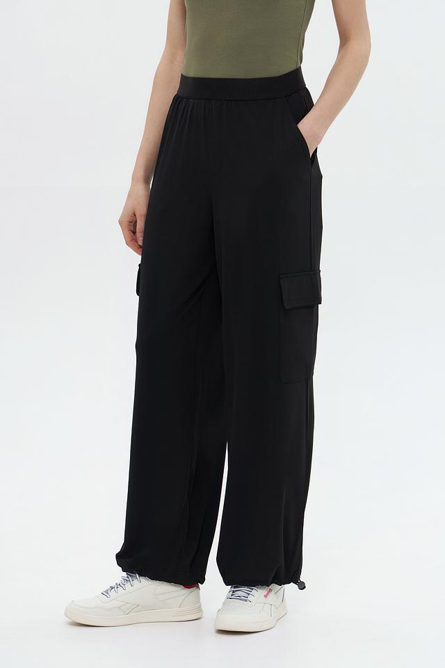 Чёрные брюки карго от Miss Lagotte — стильная и удобная модель с эластичным поясом и боковыми карманами. Изготовлены из полиэстера с добавлением эластана для комфортной посадки и свободы движений. Состав: полиэстер 92%, эластан 8%