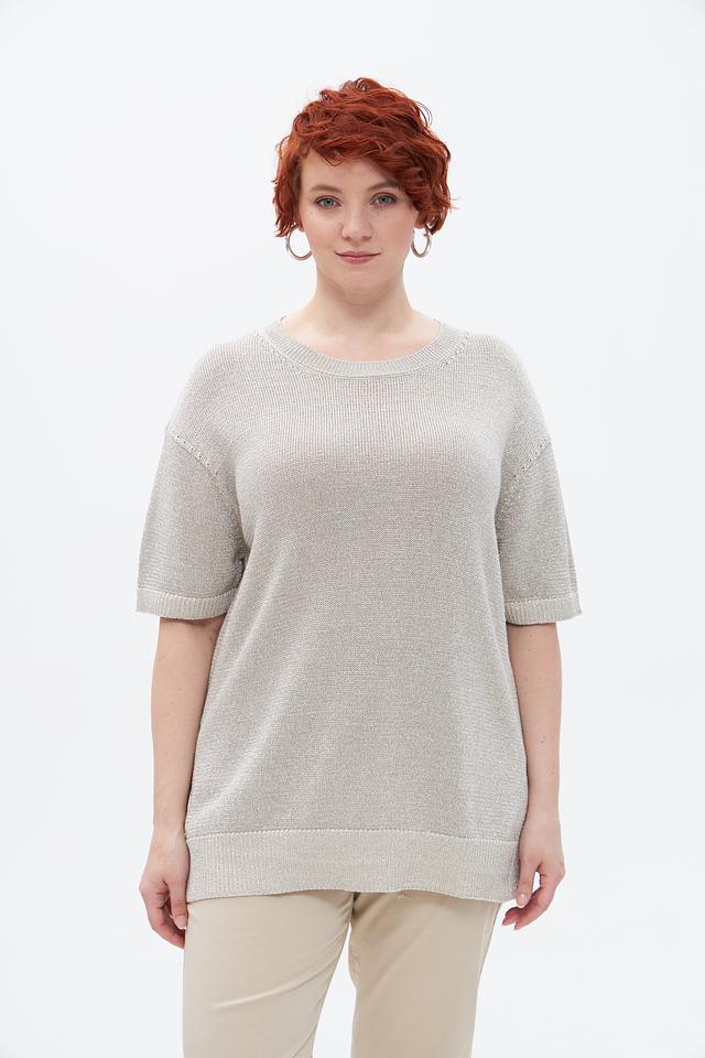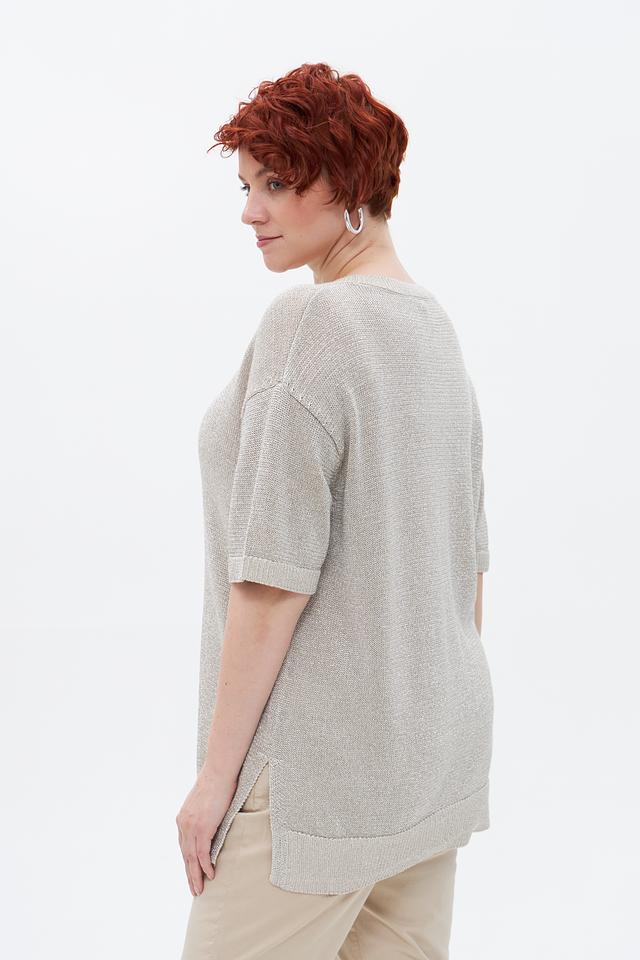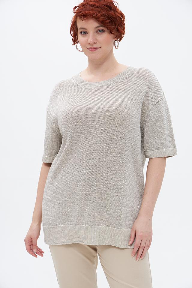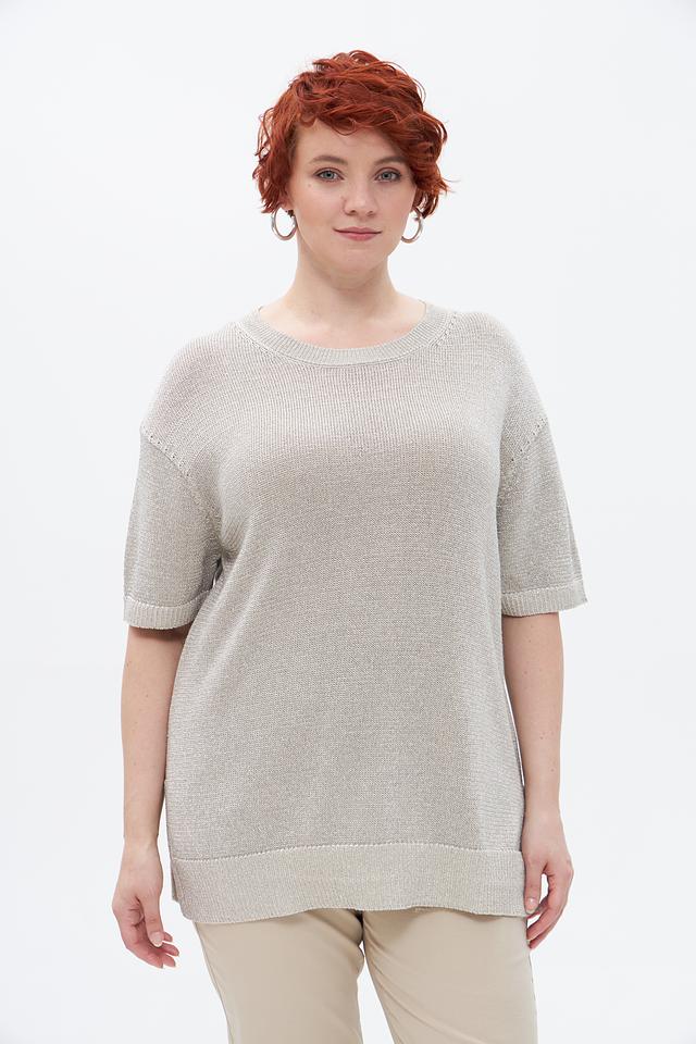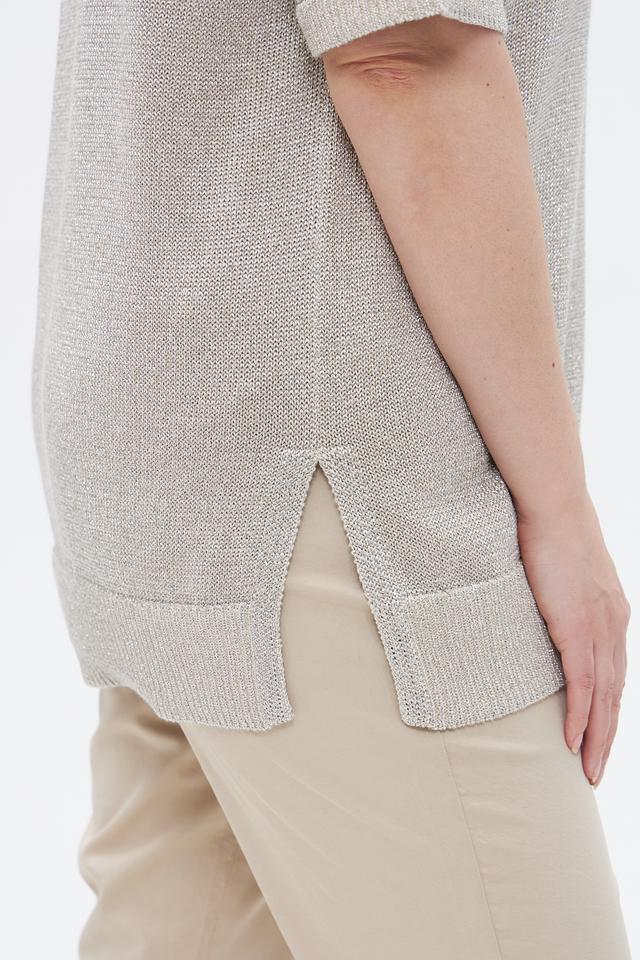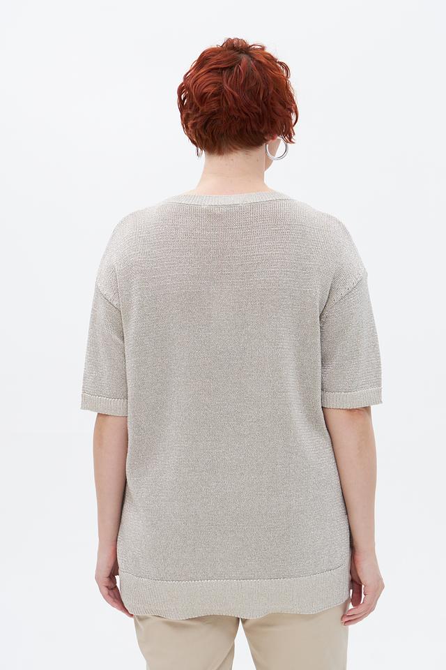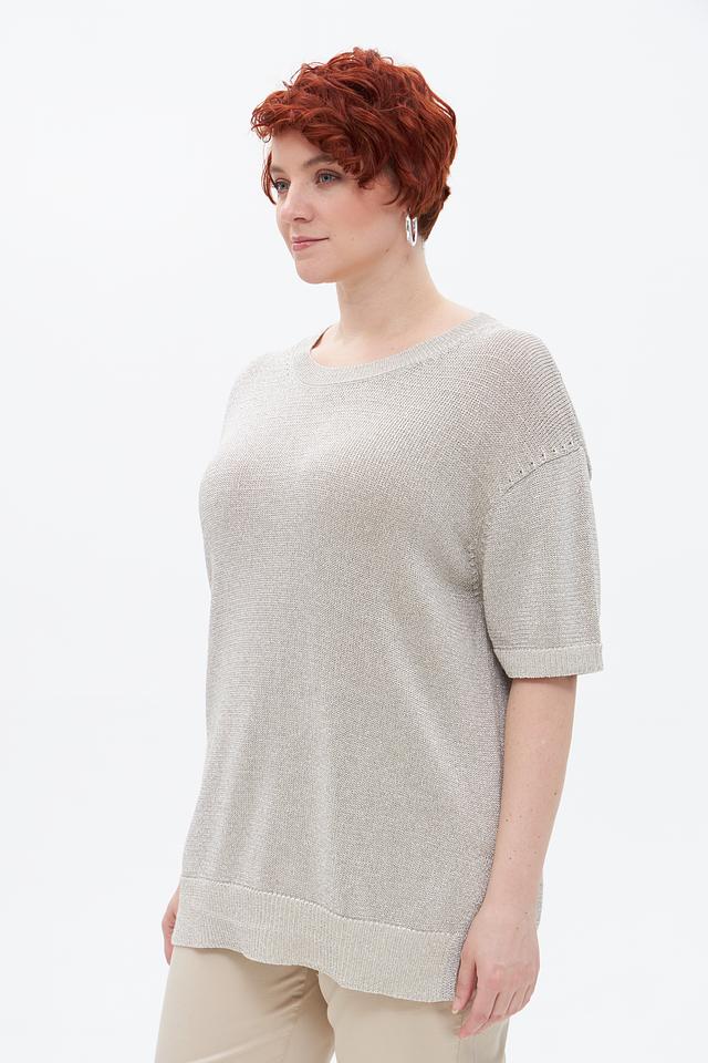 Пуловер имеет короткий рукав и классический круглый вырез горловины. Боковые разрезы добавляют динамики силуэту и обеспечивают свободу движений. Текстурное вязание и наличие металлической нити придают изделию изысканность и оригинальность.