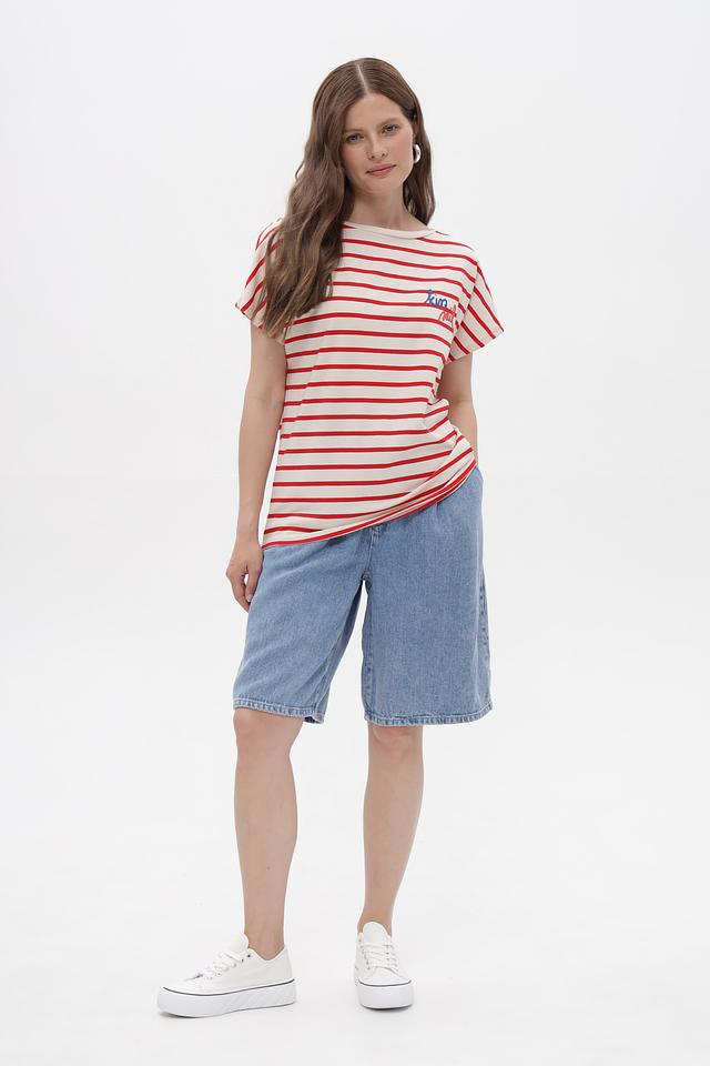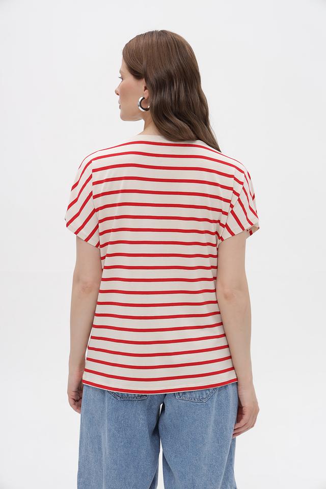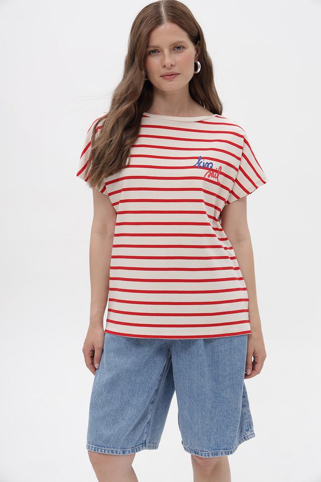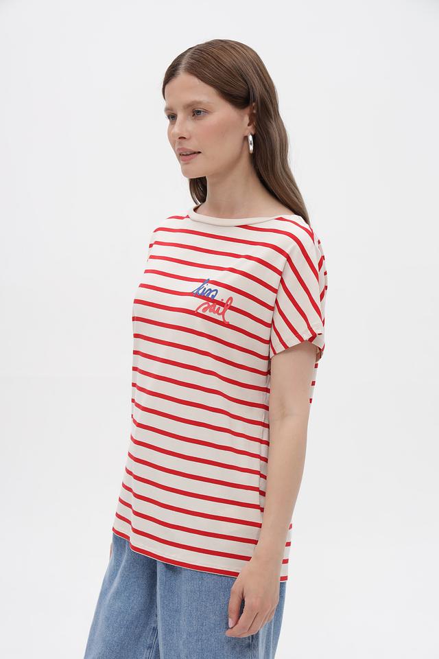 Женская футболка Miss Lagotte в классическую красную и белую полоску. Изготовлена из мягкого хлопка с модалом, обеспечивающего комфорт и приятные ощущения на коже. Состав: хлопок 47%, модал 47%, эластан 6%