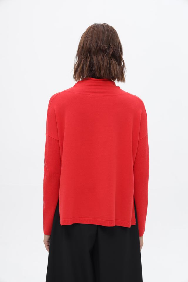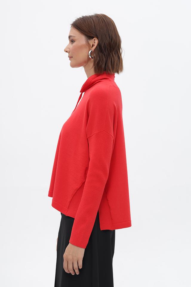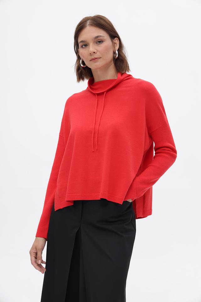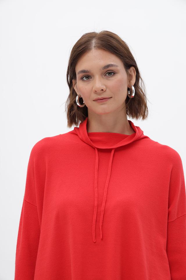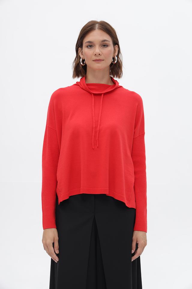 Модель имеет прямой крой, длинные рукава и капюшон со шнурками, которые добавляют образу непринужденности. Яркий красный цвет пуловера подчеркнет вашу индивидуальность и привлечет внимание.