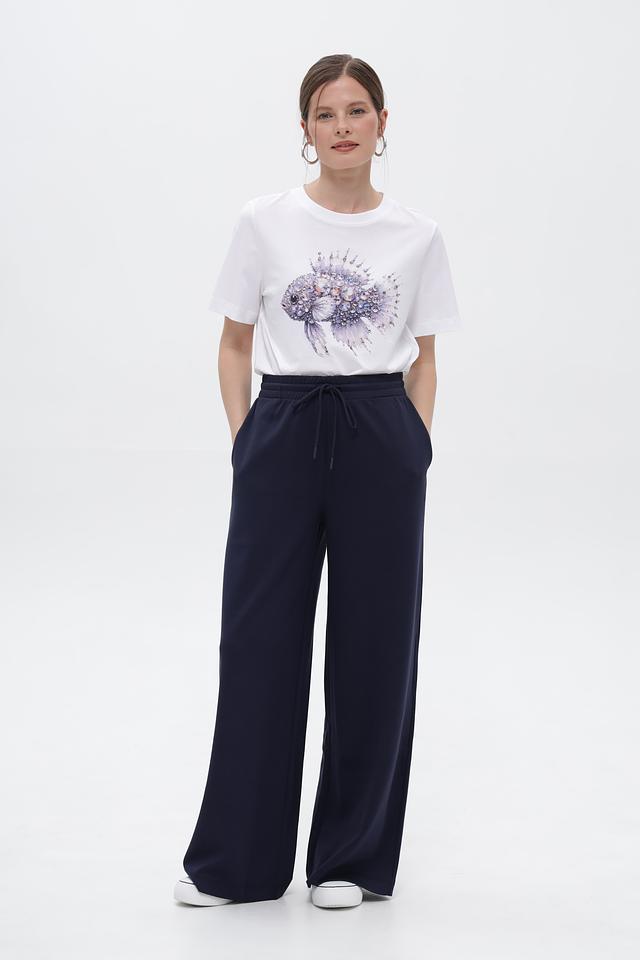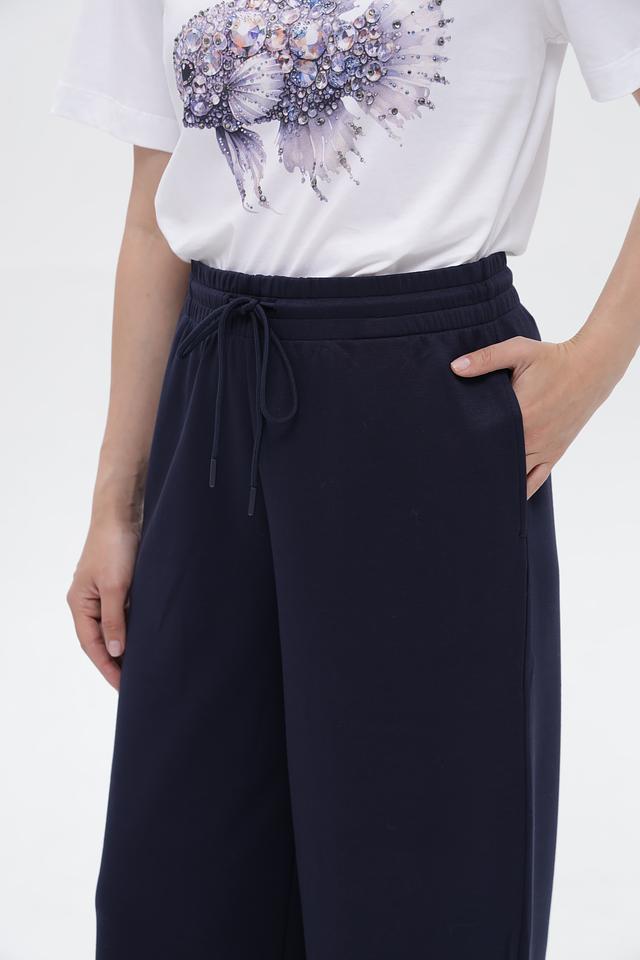 Брюки имеют широкий крой, который обеспечивает комфорт и свободу движений. Эластичный пояс с кулиской позволяет регулировать посадку по фигуре. Боковые карманы добавляют функциональности.