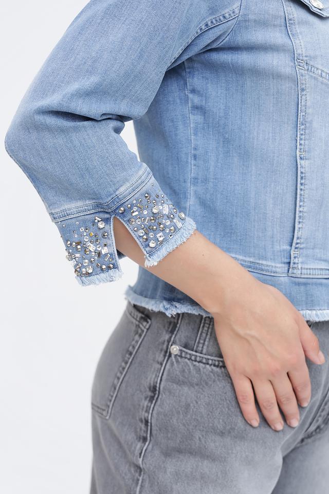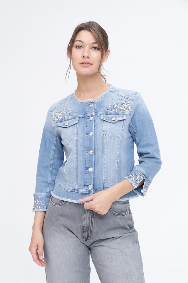 Жакет Monari голубого цвета выполнен из денима и украшен вышивкой со стразами. Модель с ¾ рукавами и слегка укороченным силуэтом станет стильным дополнением к вашему образу. Состав: хлопок 89%, полиэстер 8%, эластан 3%
