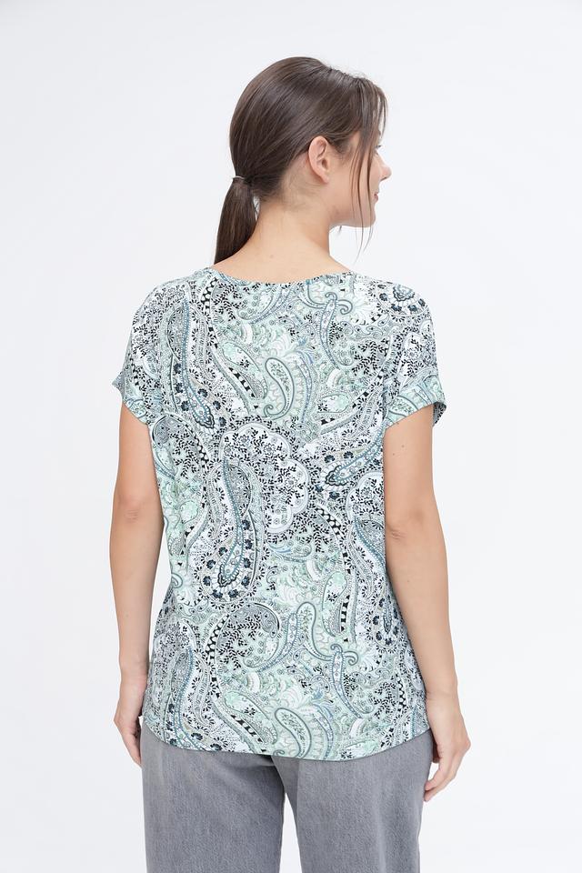 Основной цвет футболки – бирюзовый, украшен эффектным принтом пейсли в белых, серых и тёмно-синих тонах. Принт покрывает всю поверхность изделия, создавая яркий и запоминающийся образ.