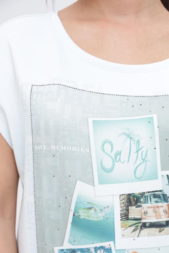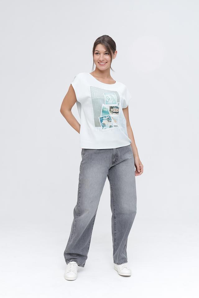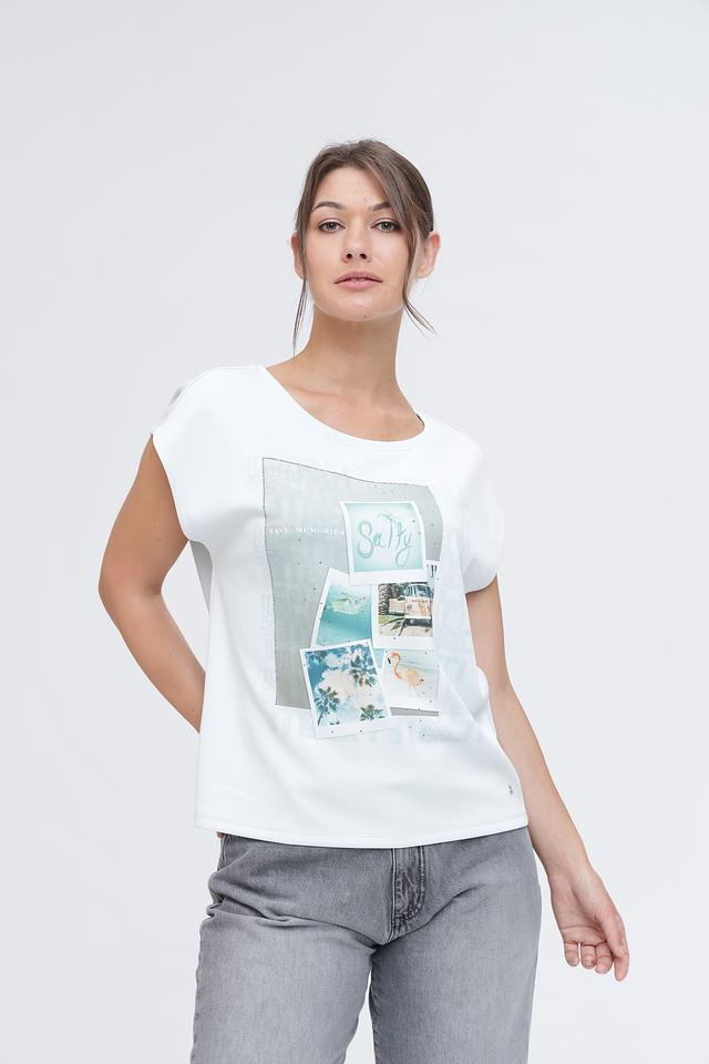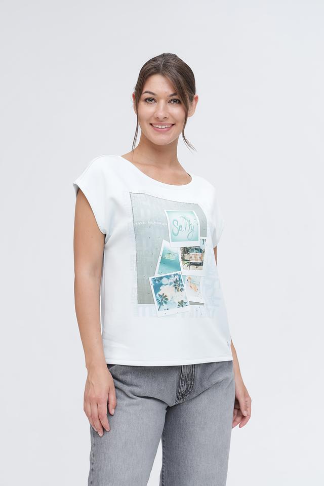 Белая футболка Monari с ярким принтом в стиле полярных карточек. Модель выполнена из мягкого модала с добавлением полиэстера и эластана, обеспечивающих комфорт и хорошую посадку. Состав: модал 55%, полиэстер 40%, эластан 5%
