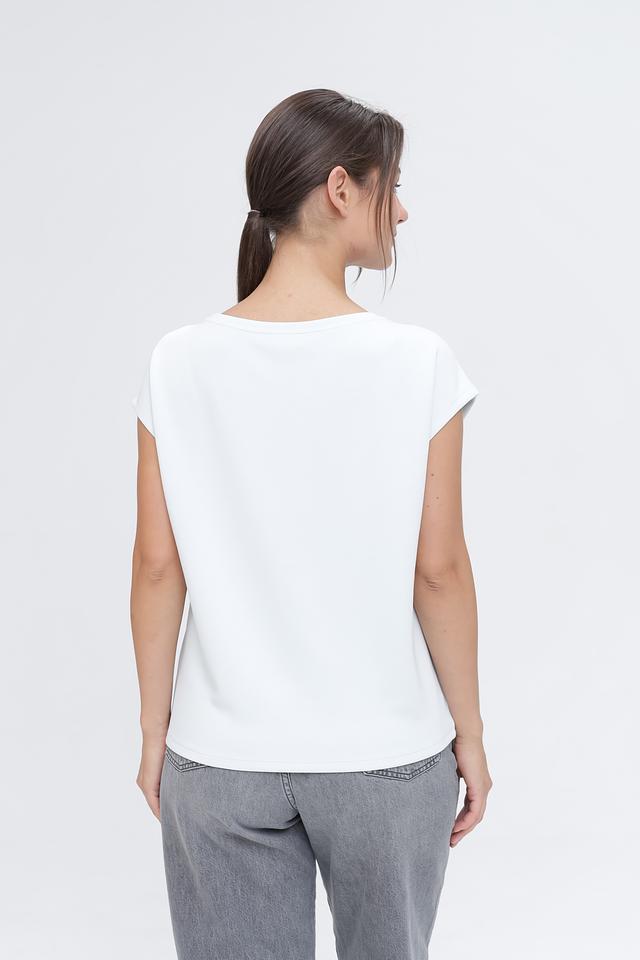 Футболка имеет прямой крой и короткие рукава с небольшим отворотом, что придает ей современный и непринужденный вид. Округлый вырез горловины декорирован небольшими стразами, добавляющими изысканности.