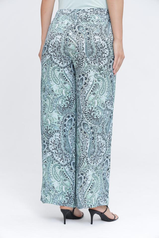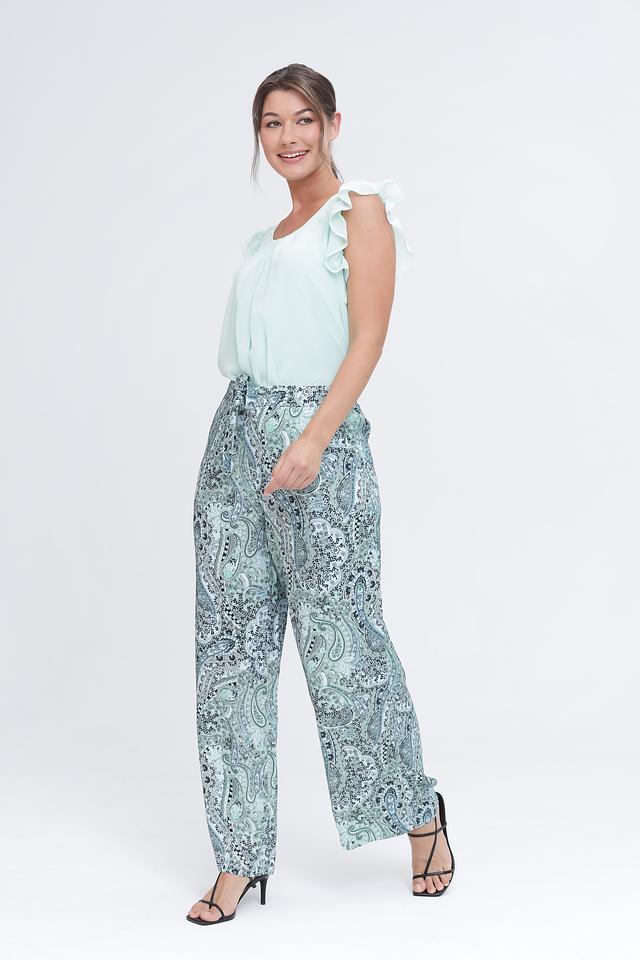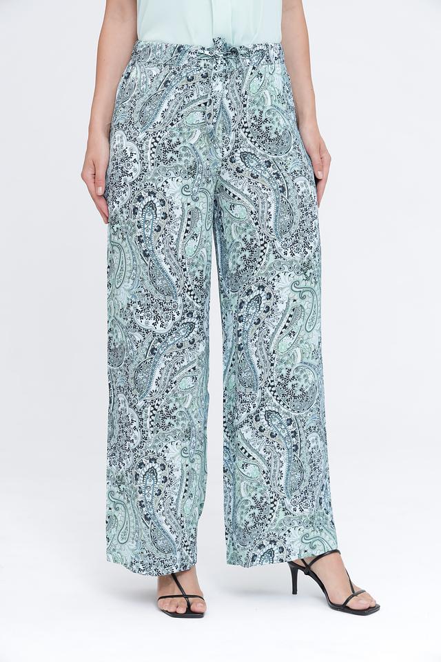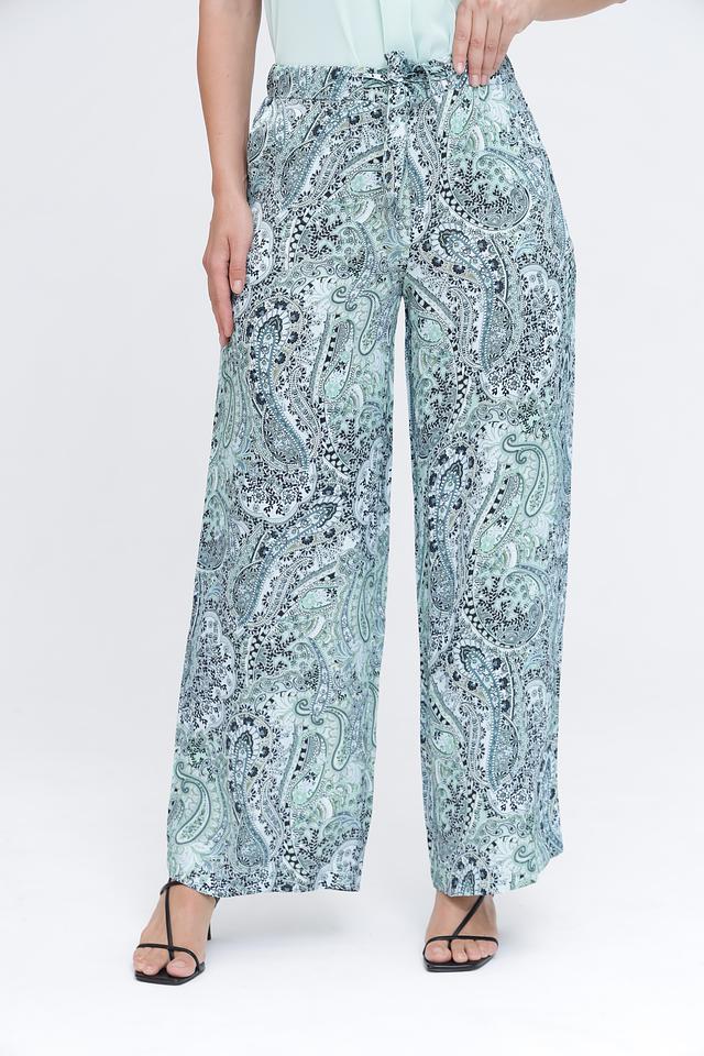Особенностью модели является яркий и запоминающийся принт пейсли в бирюзовых, белых и черных тонах. Прямой крой и широкие штанины обеспечивают свободу движений и создают элегантный силуэт.