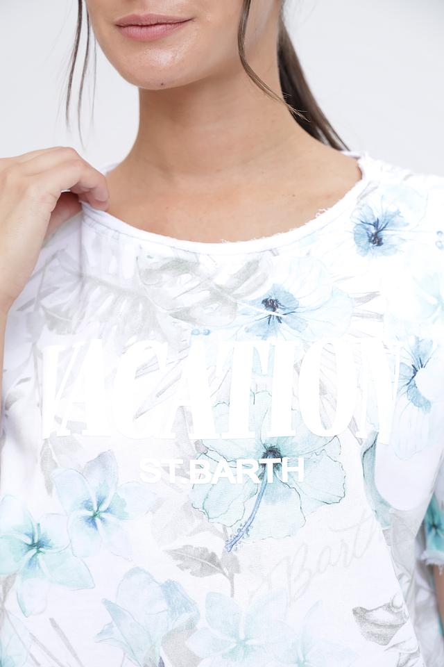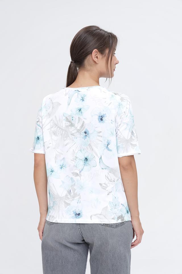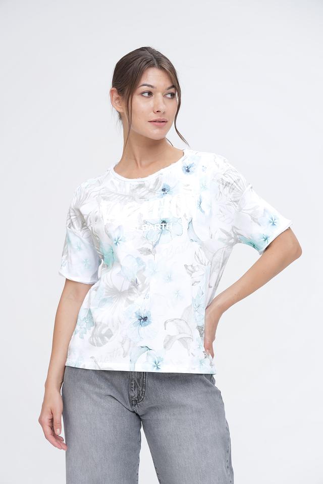 Эта стильная футболка от Monari выполнена из мягкого и приятного к телу 100% хлопка. Преобладающий цвет – белый, украшенный изысканным цветочным принтом в голубых и серых тонах.