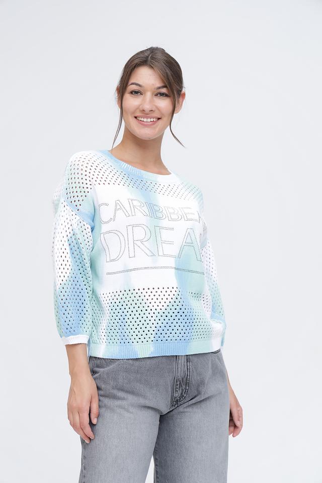 Пуловер имеет свободный крой и короткие рукава, что делает его идеальным для тёплой погоды. Ажурная вязка добавляет лёгкости и воздушности, а яркий принт "Caribbean Dream" привносит нотку летнего настроения.