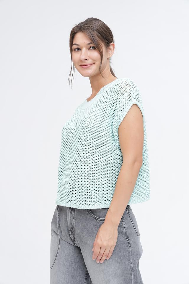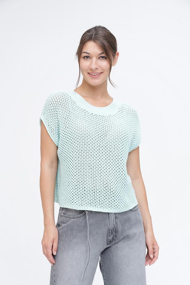 Мятный пуловер от Monari – это лёгкий и стильный выбор для тёплой погоды. Ажурная вязка придает модели воздушность, а короткий рукав делает ее удобной для повседневной носки. Изготовлен из 100% хлопка. Состав: хлопок 100%