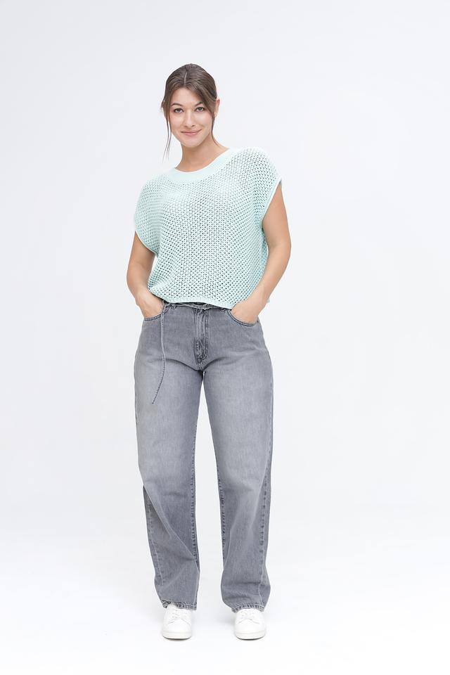 Особенностью модели является ажурная вязка, которая делает пуловер воздушным и позволяет коже дышать. Короткий рукав обеспечивает комфорт в теплую погоду, а свободный крой не сковывает движений.