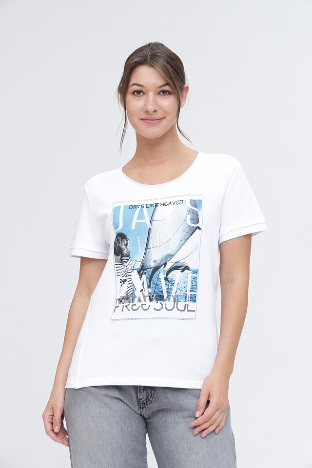 Белая футболка Monari с ярким графичным принтом на тему парусного спорта. Изготовлена из 100% хлопка, обеспечивающего комфорт и воздухопроницаемость. Стильный и оригинальный выбор для повседневного образа. Состав: хлопок 100%