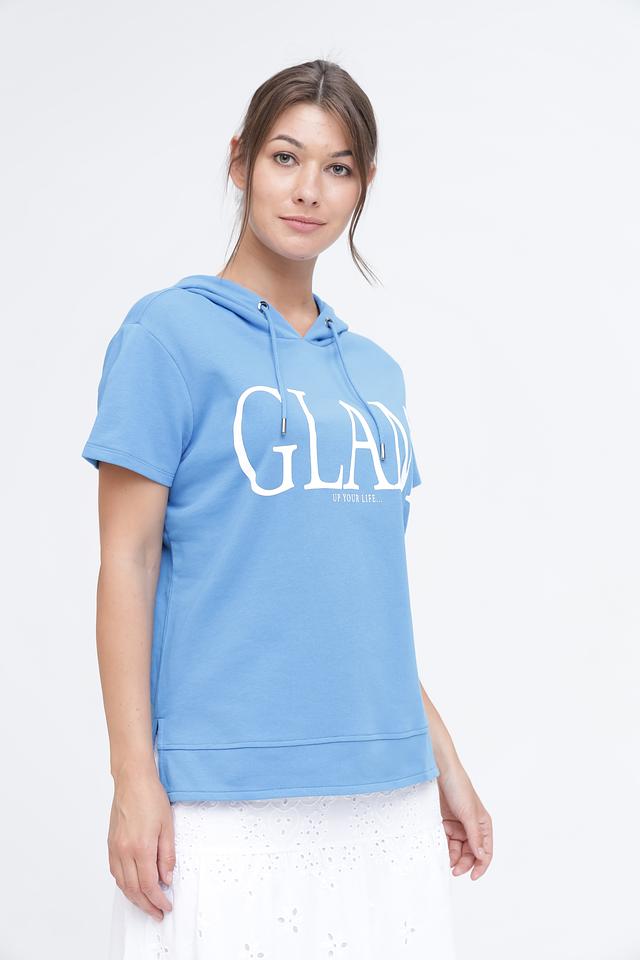 Голубой пуловер от Monari с коротким рукавом и капюшоном украшен белой надписью "GLAM". Модель выполнена из мягкого хлопка и идеально подходит для создания повседневных образов. Состав: хлопок 100%