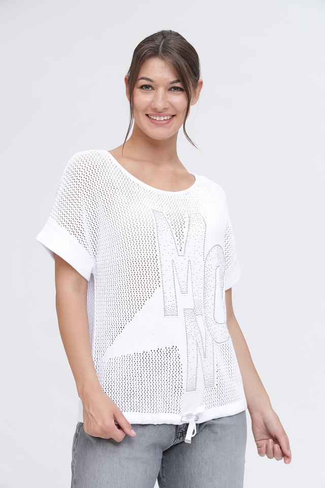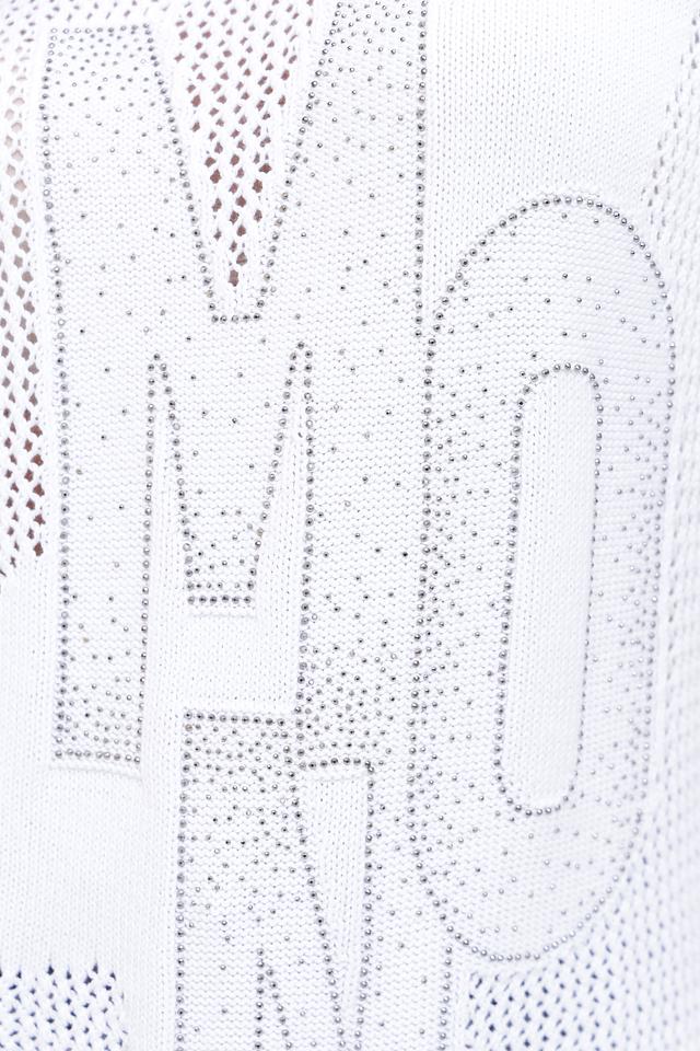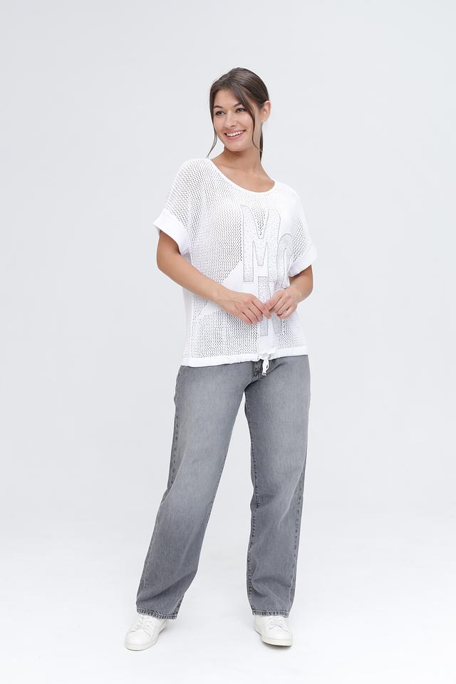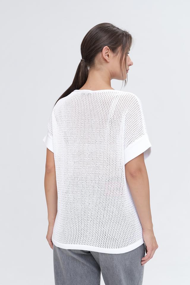Белый пуловер Monari из хлопкового полотна с ажурной вязкой и декором в виде логотипа бренда. Модель свободного кроя с короткими рукавами и V-образным вырезом. Состав: хлопок 100%