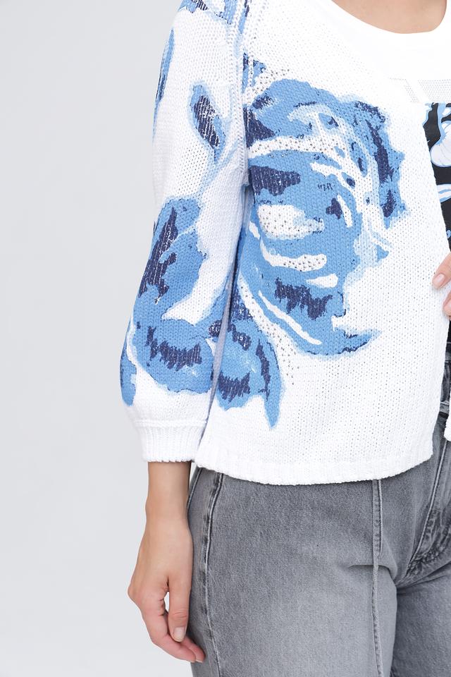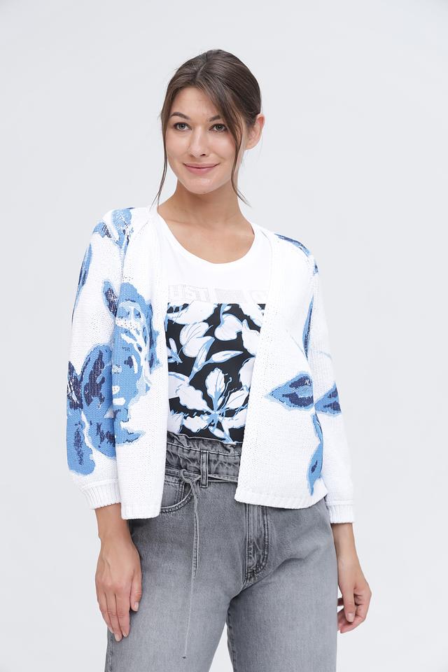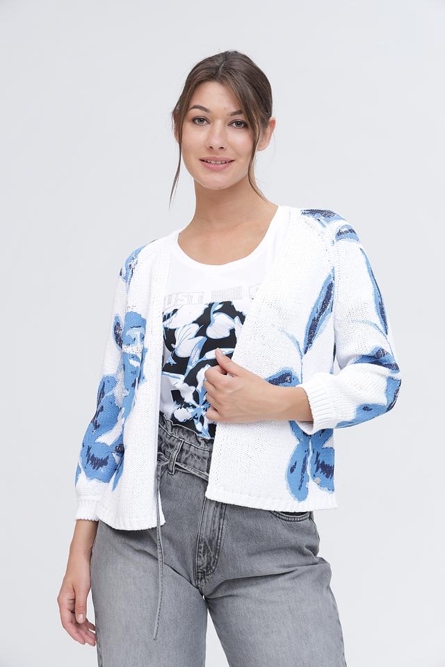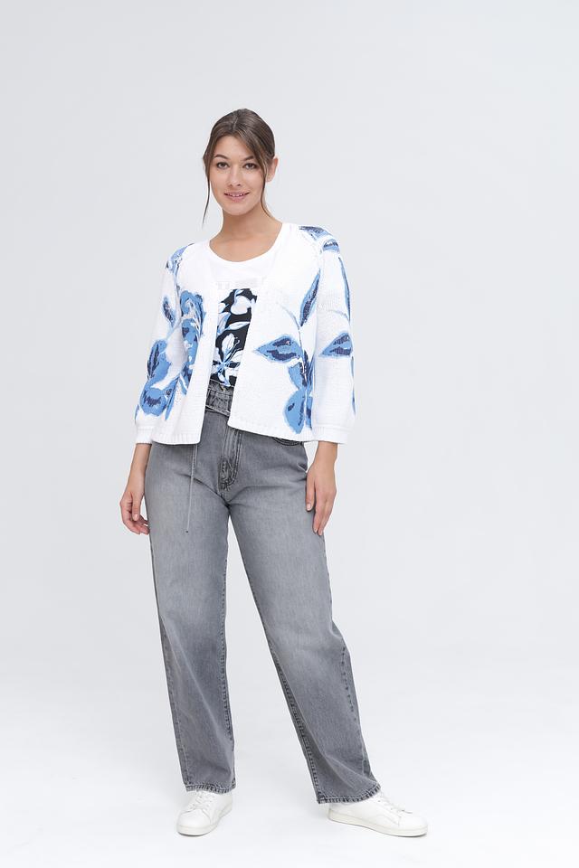 Основной цвет кардигана – белый, который служит прекрасным фоном для яркого цветочного принта в голубых тонах. Принт изображает крупные, абстрактные цветы, добавляя изделию оригинальности и свежести.