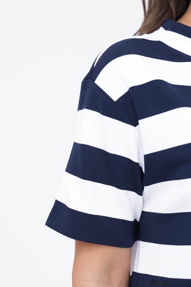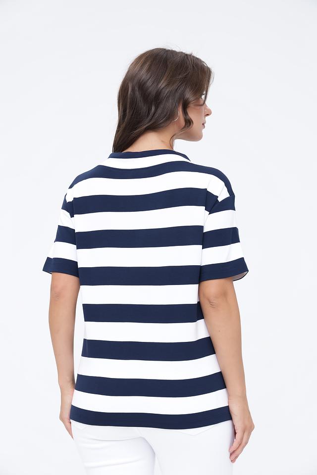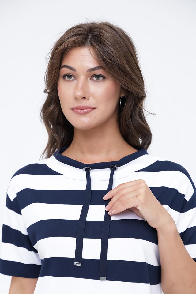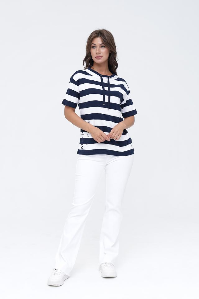 Женский пуловер Monari сине-белого цвета с коротким рукавом и завязками на вырезе. Модель выполнена в полоску и имеет удобный крой, идеально подходящий для повседневной носки. Состав: вискоза 80%, полиэстер 15%, эластан 5%
