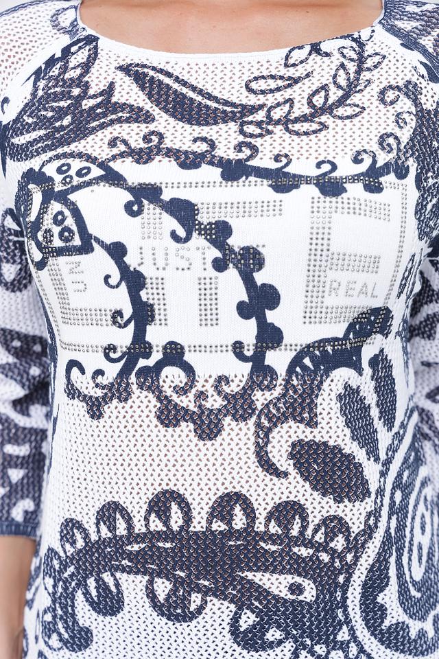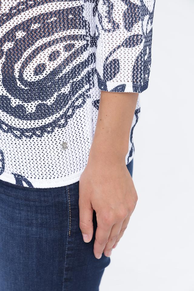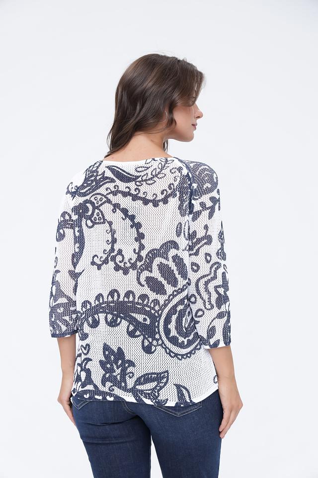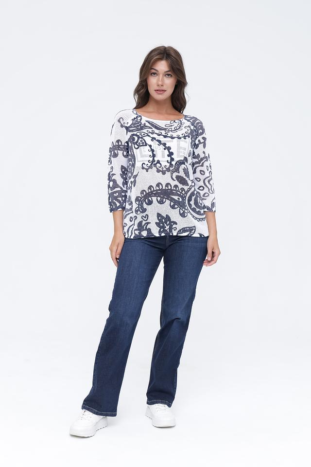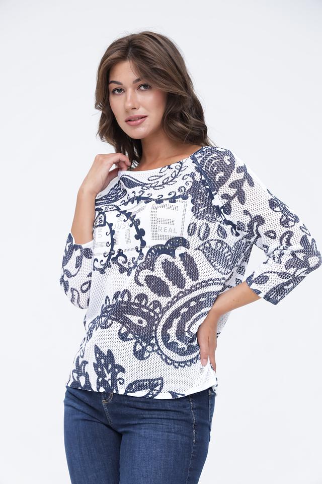 Этот стильный пуловер от Monari выполнен в белом цвете и украшен изысканным цветочным принтом в синих тонах. Модель имеет округлый вырез горловины и короткие рукава ¾, что делает ее универсальной для создания различных образов.