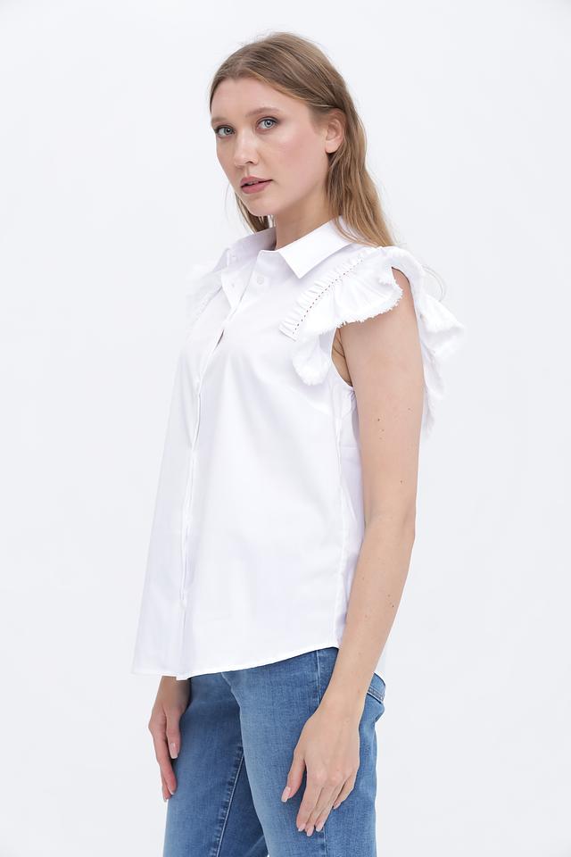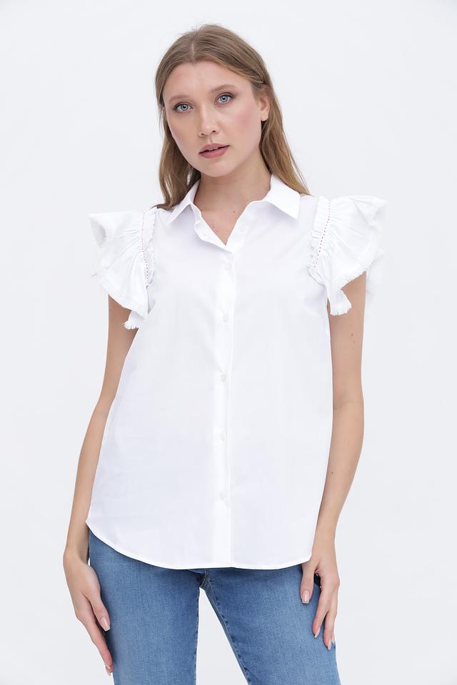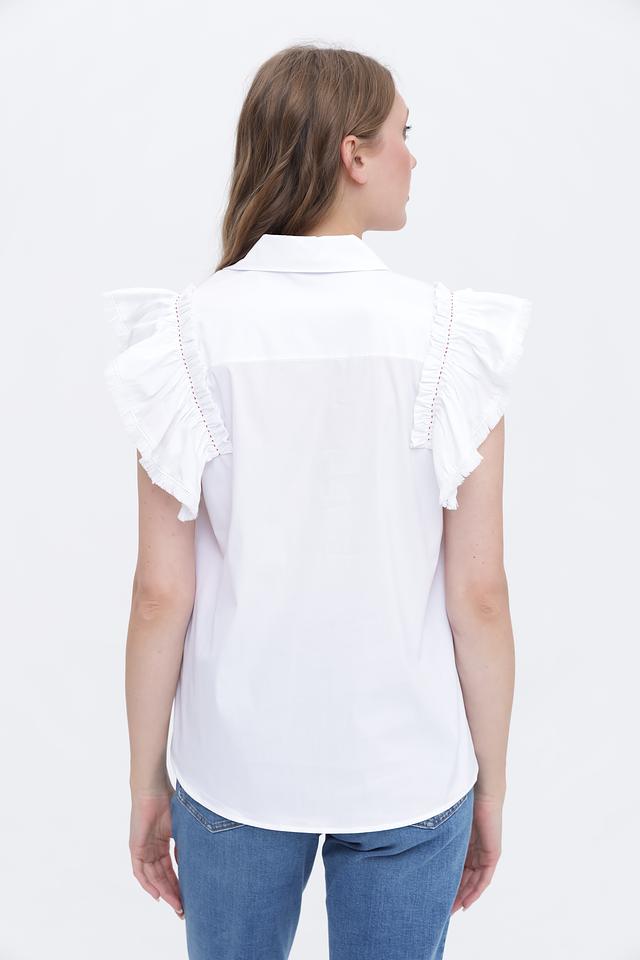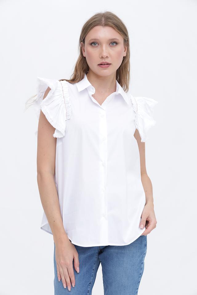 Модель имеет короткие рукава, украшенные воланами, что придает ей романтичный и женственный вид. Воротник рубашечного типа добавляет строгости и элегантности. Блуза выполнена из высококачественного хлопка, который обеспечивает комфорт и воздухопроницаемость.