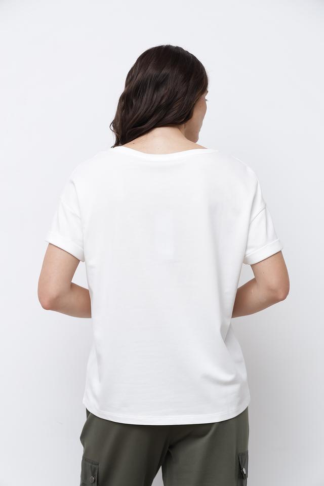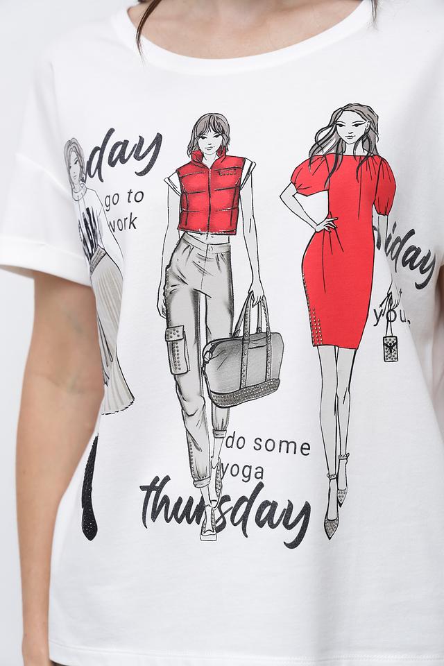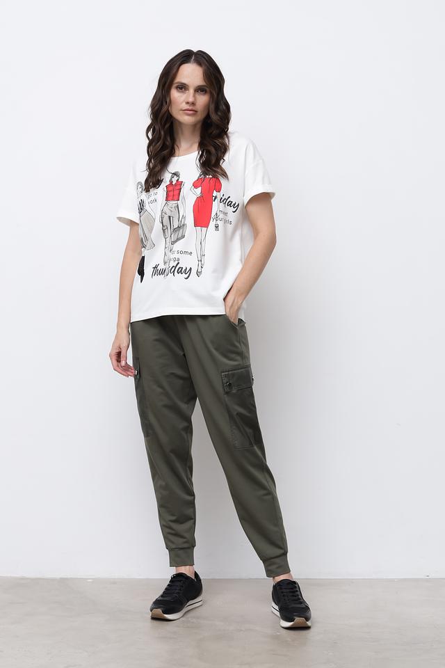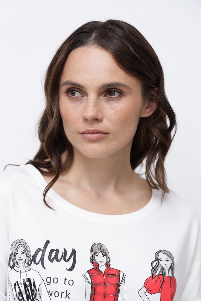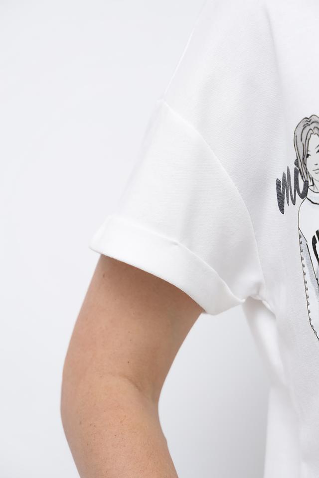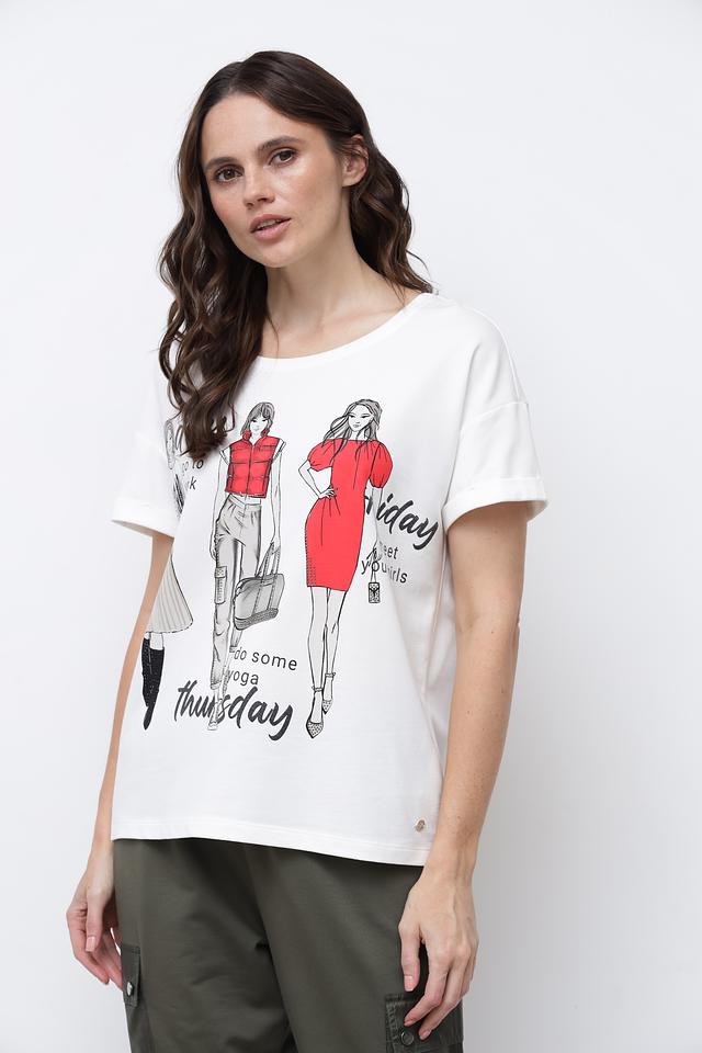 Белая футболка Monari с оригинальным принтом в виде стилизованных иллюстраций. Модель свободного кроя с короткими рукавами и округлым вырезом горловины выполнена из мягкого хлопка с модалом. Состав: хлопок 50%, модал 50%