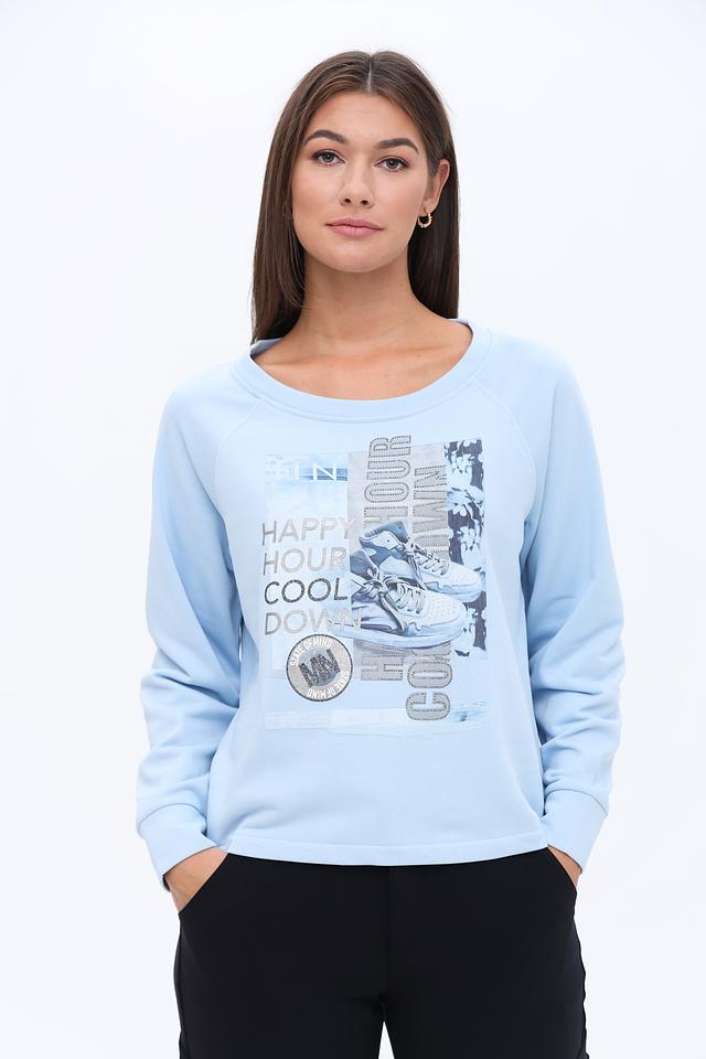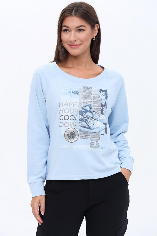 Женский пуловер Monari голубого цвета с ярким принтом на лицевой стороне. Изготовлен из мягкого хлопка с добавлением полиэстера для комфорта и износостойкости. Стильный и удобный выбор для повседневного гардероба. Состав: хлопок 80%, полиэстер 20%