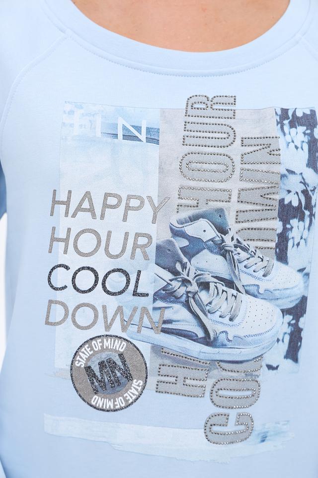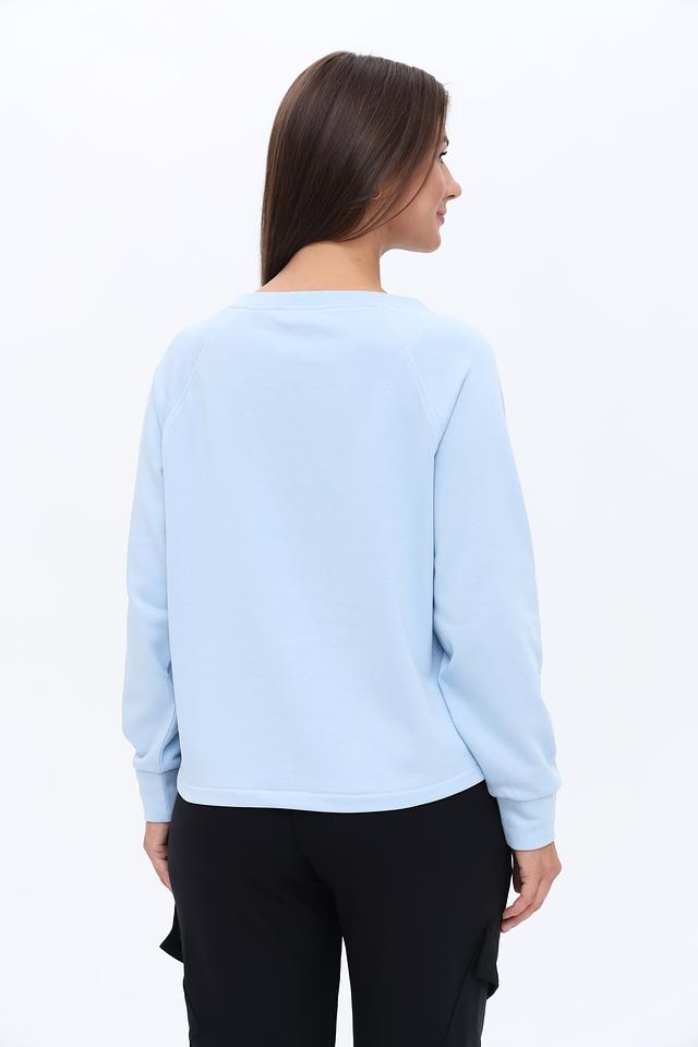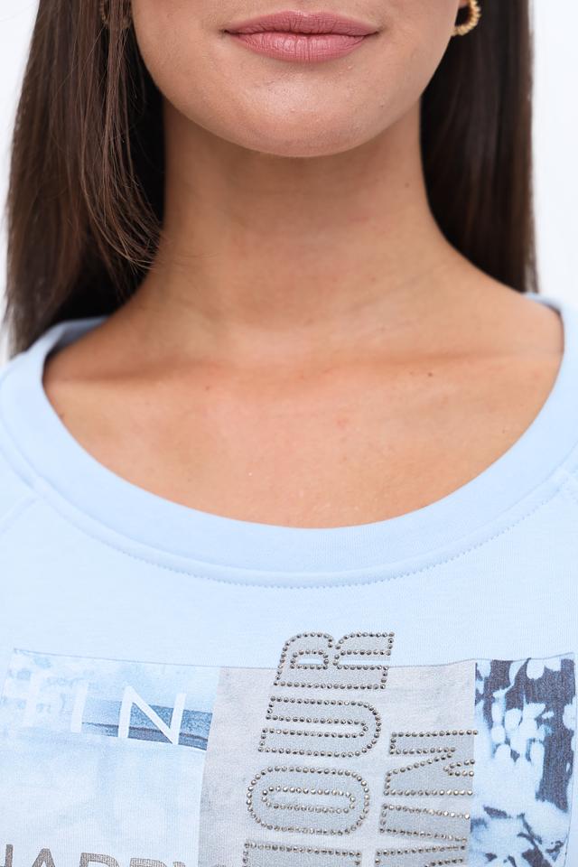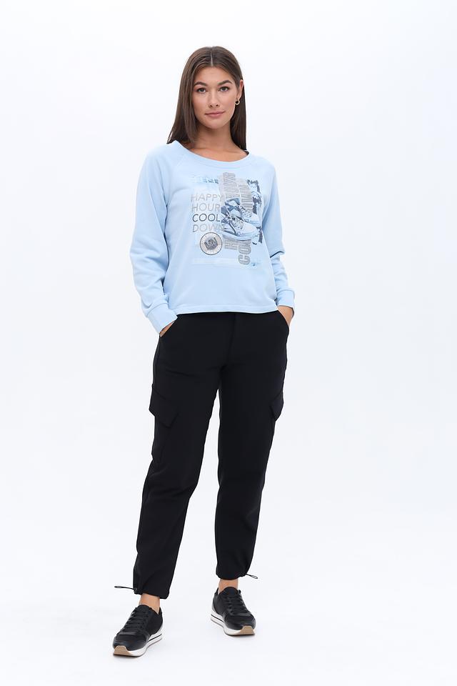 Пуловер имеет свободный крой, круглый вырез горловины и длинные рукава. Основной цвет – нежно-голубой, который прекрасно сочетается с различными оттенками. Главная особенность модели – яркий принт на передней части, изображающий графические элементы и надписи.