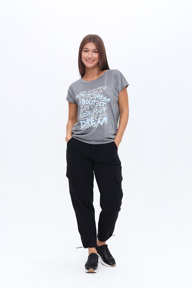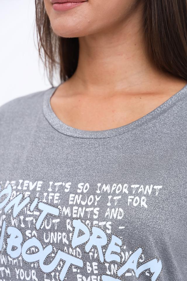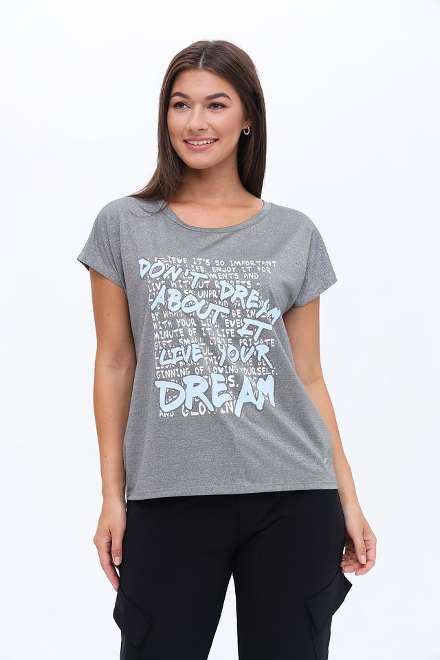 Женская футболка Monari серого цвета с оригинальным принтом. Изготовлена из мягкой вискозы с добавлением полиэстера и эластана, обеспечивающих комфорт и хорошую посадку по фигуре. Состав: вискоза 77%, метализ.полиэстер 21%, эластан 2%