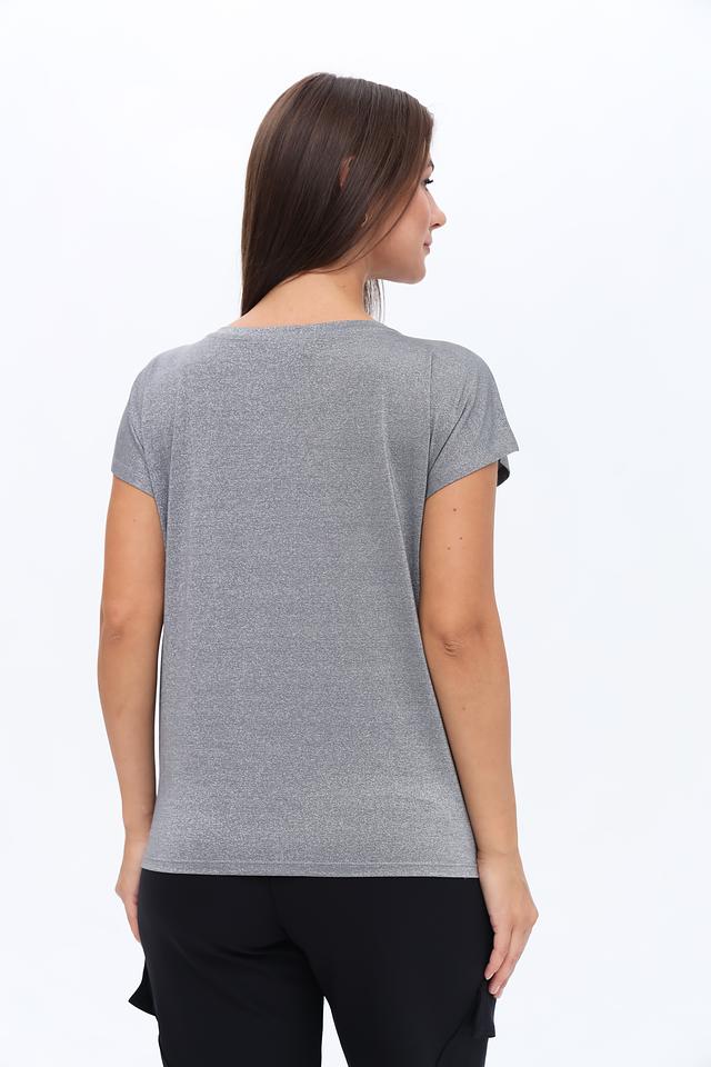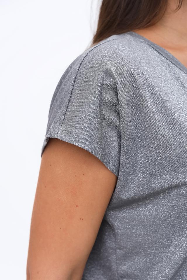 Модель имеет свободный крой и короткие рукава, что обеспечивает максимальный комфорт в жаркую погоду. Ткань, состоящая из вискозы, метализированного полиэстера и эластана, приятна к телу и хорошо держит форму.