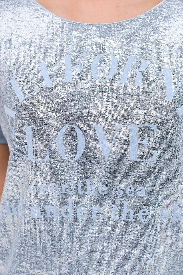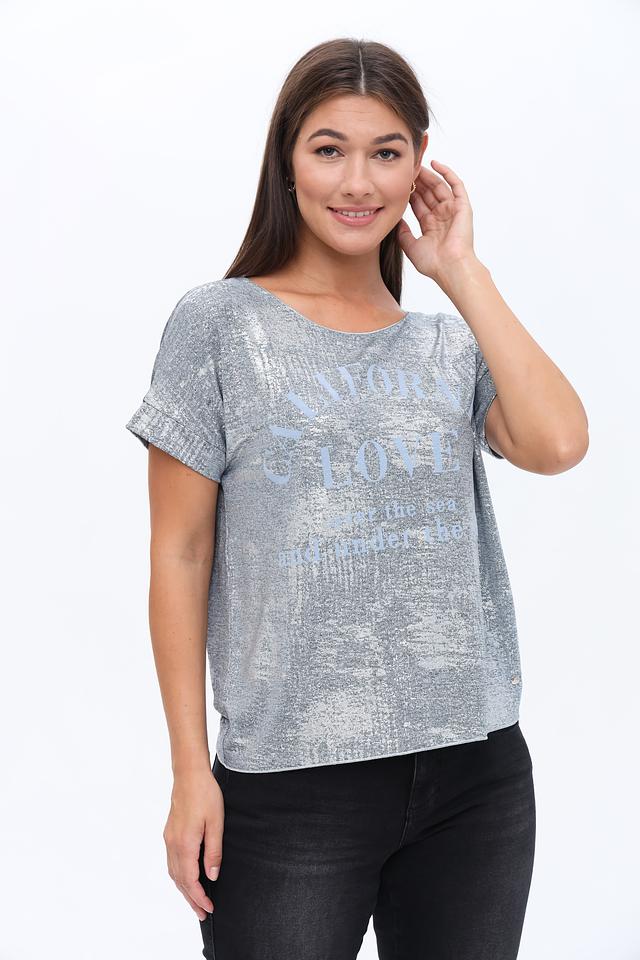 Эта стильная блуза от Monari выполнена в серебристом цвете и украшена ярким принтом с надписями. Модель имеет свободный крой, который обеспечивает комфорт в носке, а короткие рукава делают ее идеальным выбором для теплой погоды.
