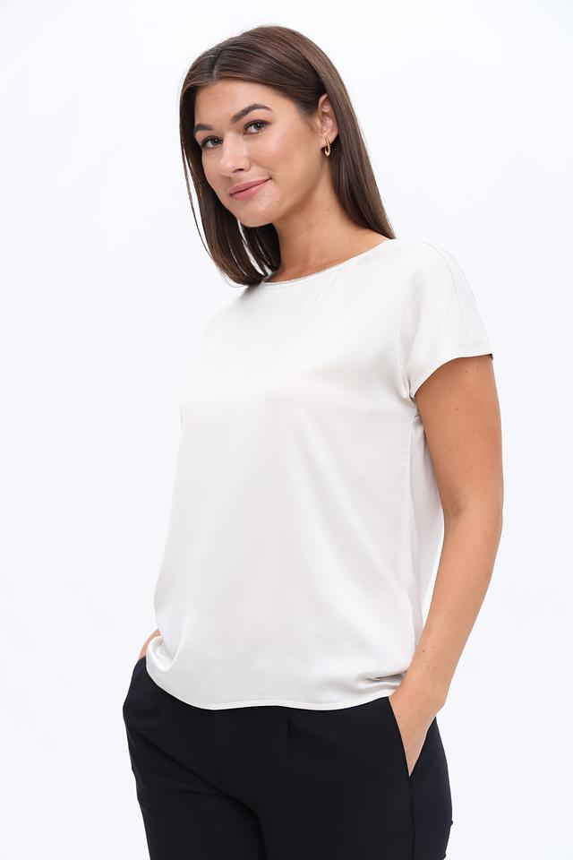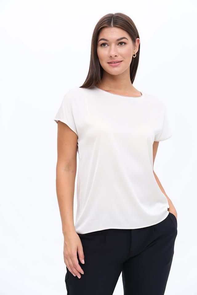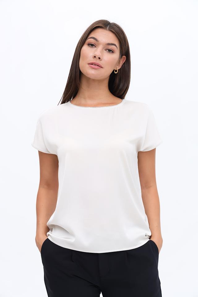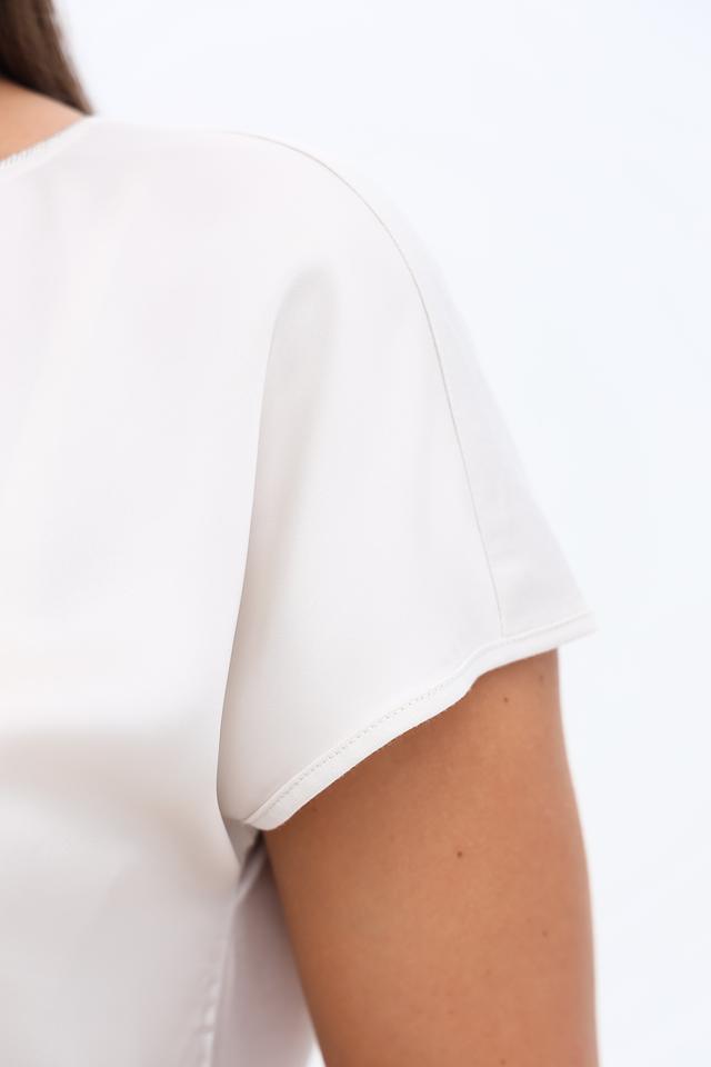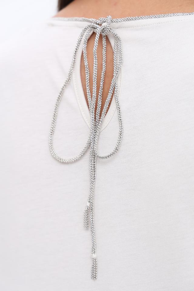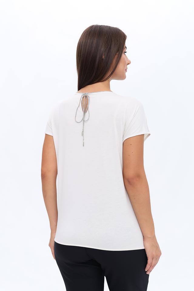 Блуза имеет прямой крой, короткие рукава и округлый вырез горловины. Оригинальным элементом дизайна являются изящные завязки на спине, которые придают блузе женственность и изысканность.