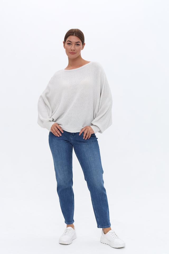 Пуловер имеет свободный крой и рукава-фонарики, которые придают ему особый шарм. Вырез горловины – лодочка. Текстура вязки мягкая и приятная на ощупь.