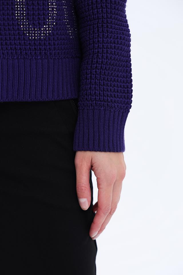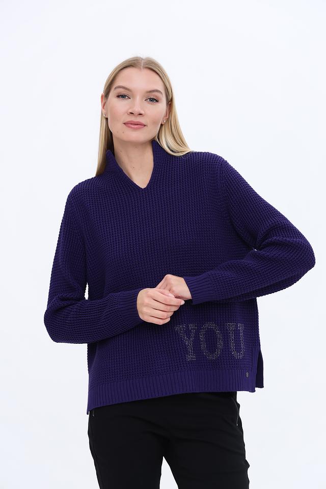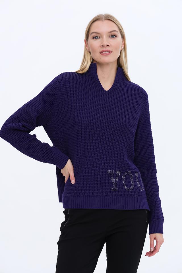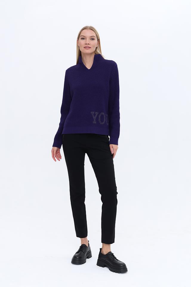 Пуловер имеет насыщенный фиолетовый цвет и свободный крой, который позволяет создать расслабленный и непринужденный образ. Передняя часть украшена стильной надписью "YOU", выполненной в виде декоративной вышивки.