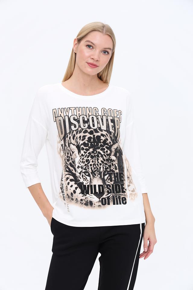Белый лонгслив Monari с ярким принтом леопарда и надписями станет стильным дополнением к вашему гардеробу. Модель выполнена из мягкой и приятной к телу ткани, обеспечивающей комфорт в течение дня. Состав: вискоза 45%, модал 45%, эластан 10%