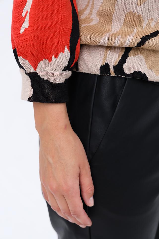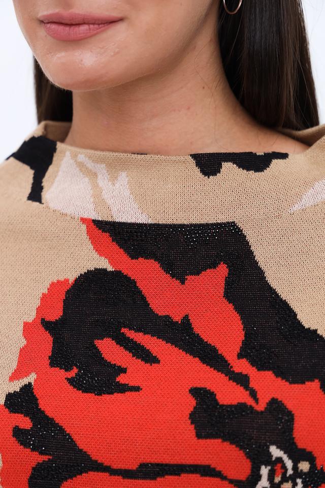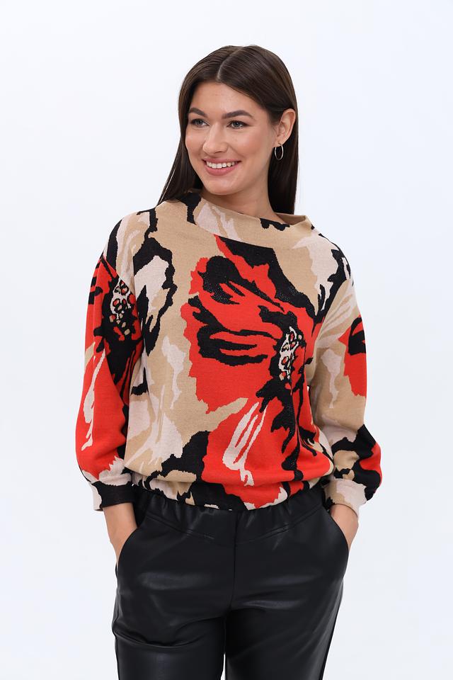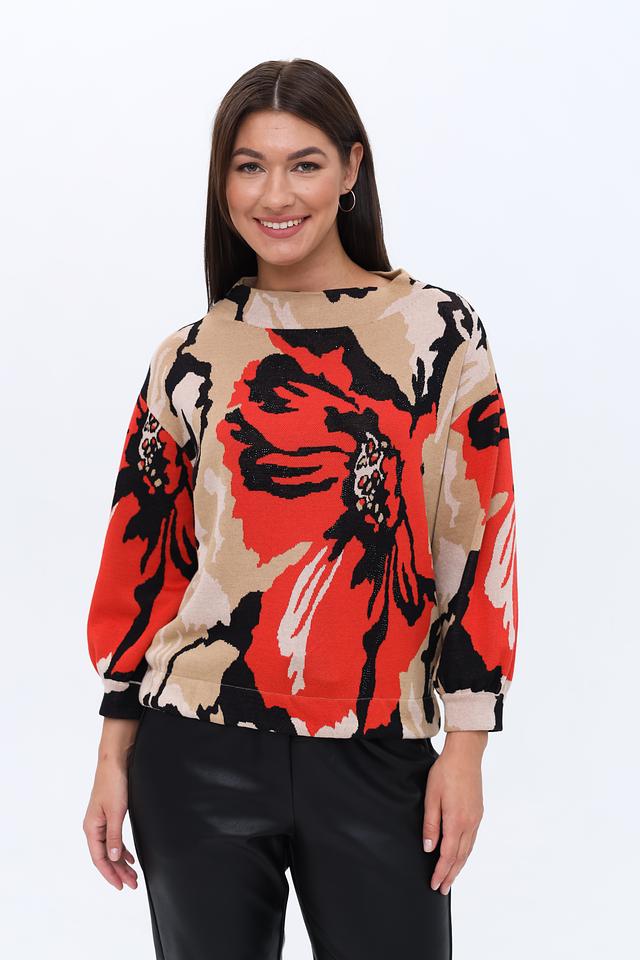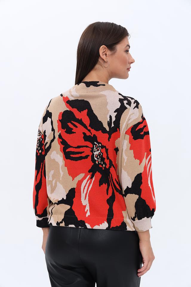 Пуловер имеет округлый вырез горловины и рукава три четверти, что делает его универсальным для различных образов. Яркий цветочный принт добавляет изделию оригинальности и привлекательности.