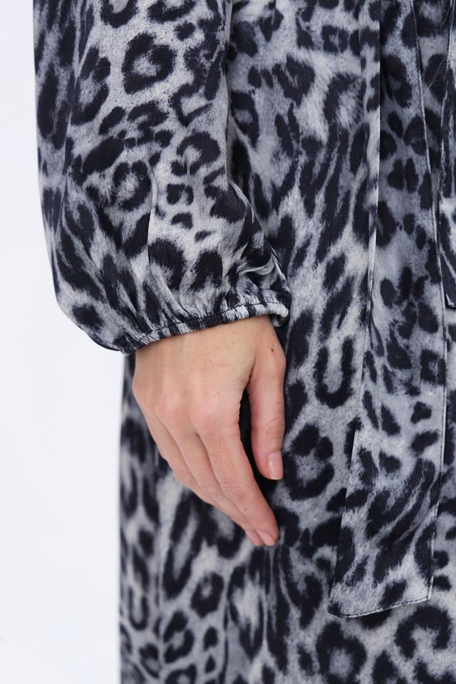 Это элегантное платье от Monari выполнено в серой цветовой гамме и украшено ярким леопардовым принтом. Платье имеет длину до колена, длинные рукава и круглый вырез горловины.