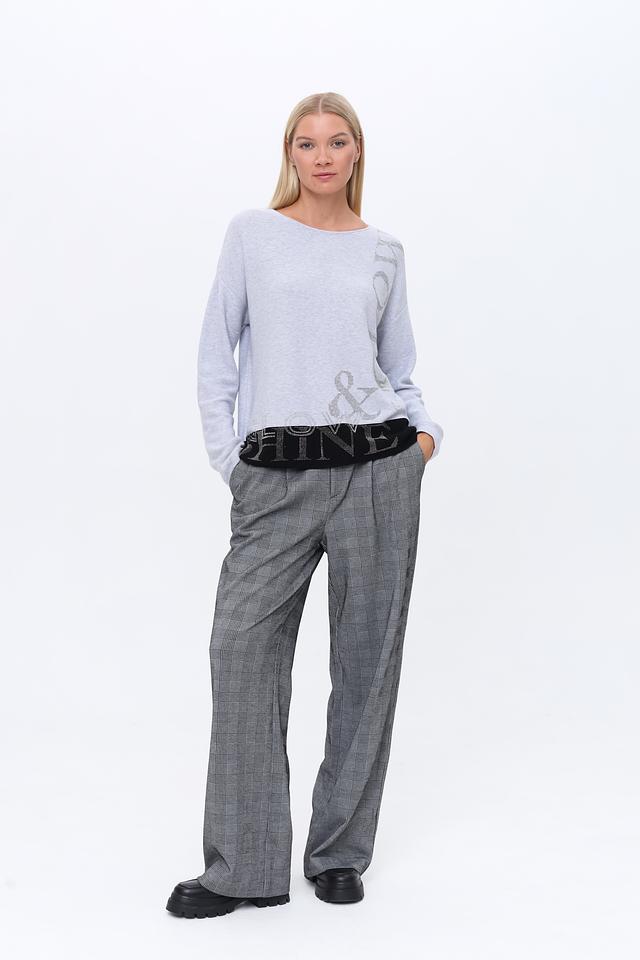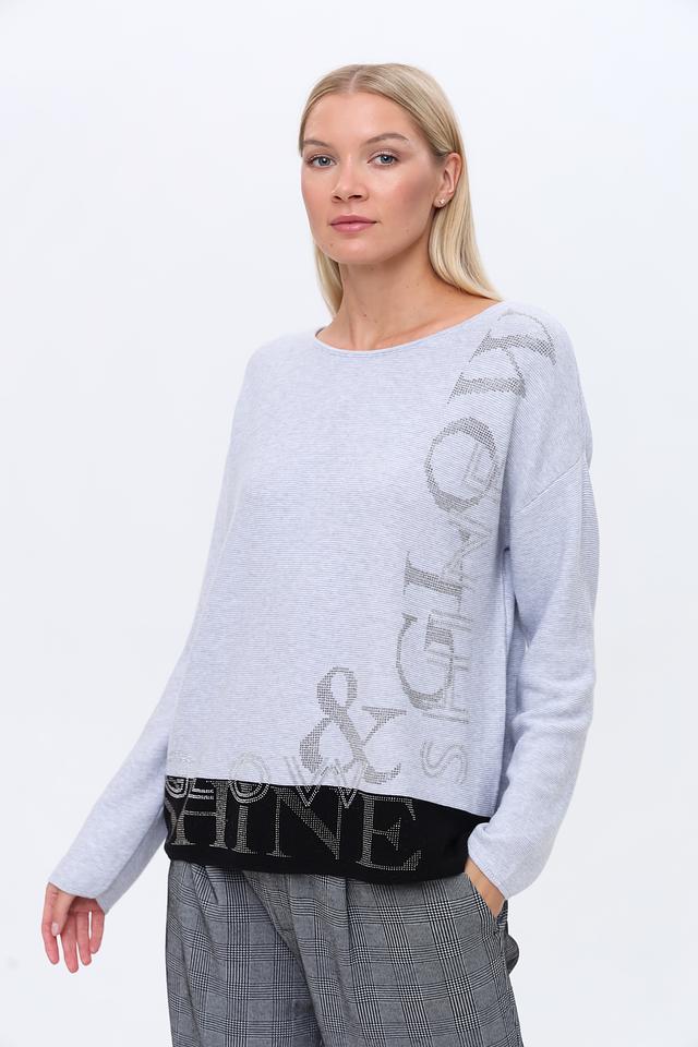Особый акцент в дизайне пуловера сделан на декоративные элементы. На передней части изделия расположена надпись "SHINE" и изображение, выполненные с использованием страз, что придает ему блеск и оригинальность. Дополнительный декор в виде надписи и абстрактного рисунка из страз украшает переднюю часть изделия.