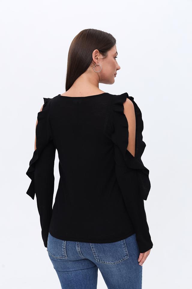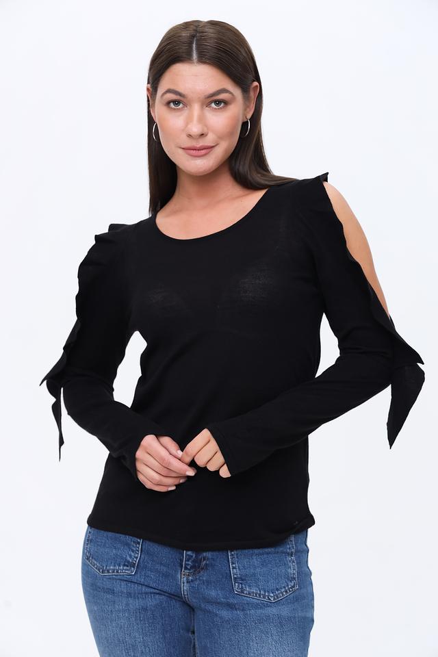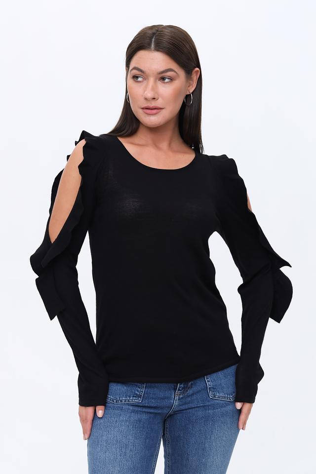 Рукава пуловера имеют оригинальную форму с воланами, добавляющими изюминку и делающими силуэт более интересным. Круглый вырез горловины подчеркивает линию шеи и позволяет сочетать пуловер с различными аксессуарами.