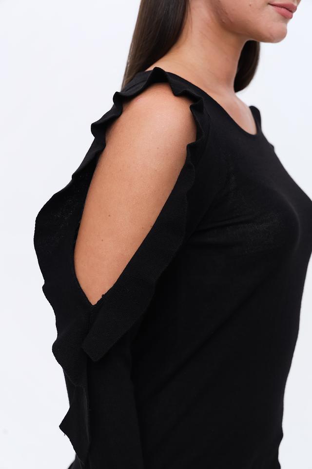 Этот элегантный пуловер от Monari выполнен в классическом чёрном цвете и отличается необычным дизайном с открытыми плечами. Благодаря этому акценту образ приобретает лёгкую женственность и кокетливость.