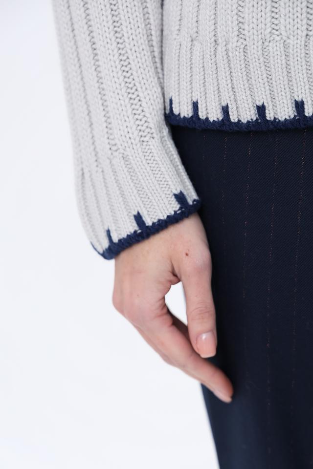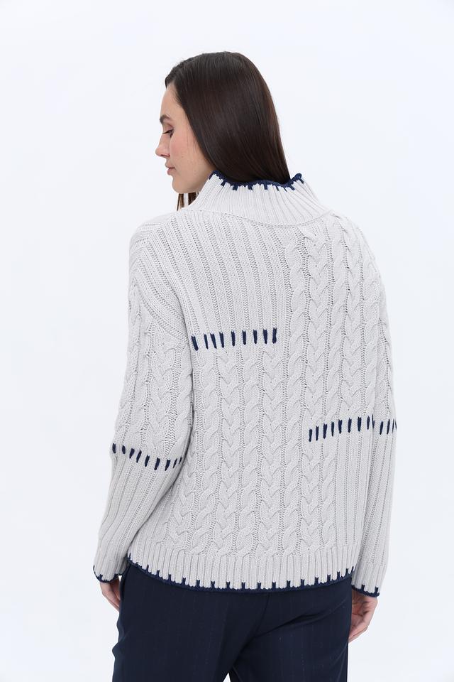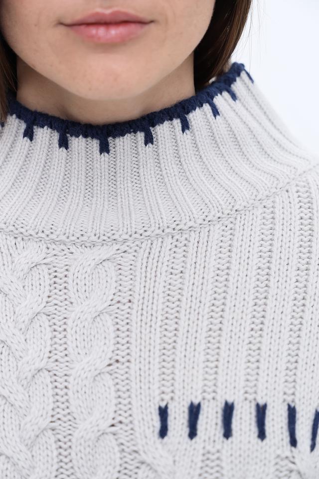 Этот пуловер от Monari выполнен в светло-сером цвете и отличается выразительным узором "косы". Модель имеет удобный крой и слегка завышенную горловину, отделанную контрастной синей вязкой.