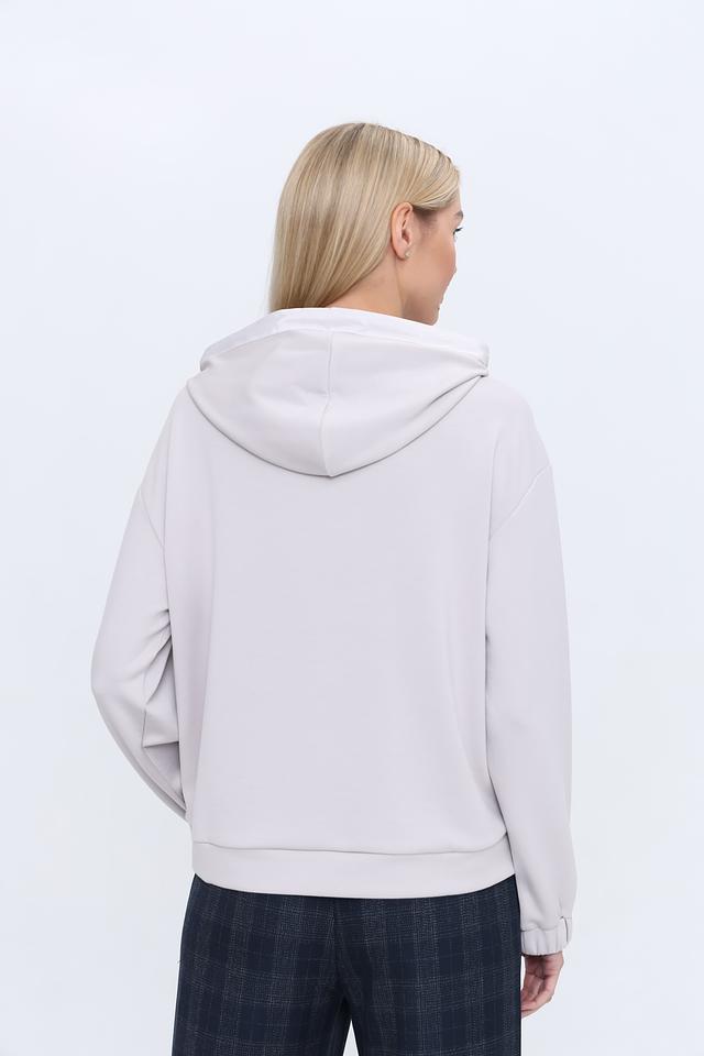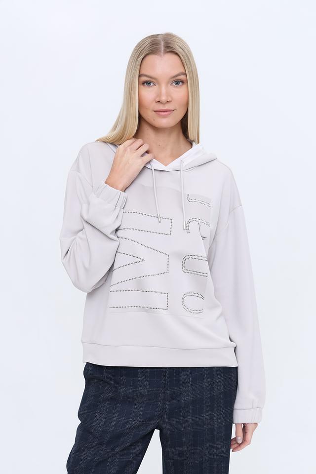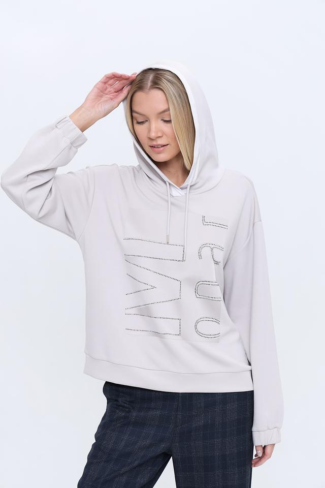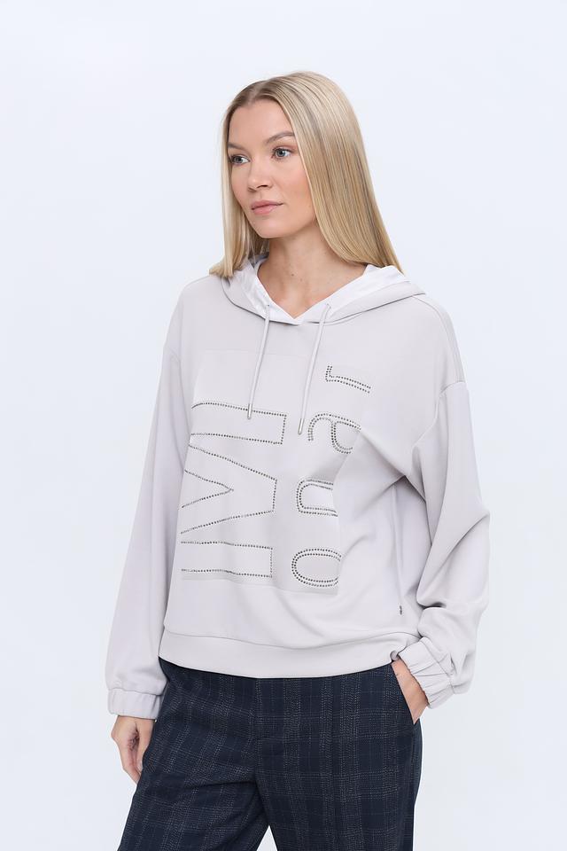 Стильный пуловер Monari светло-серого цвета с капюшоном, украшенным стразами. Модель свободного кроя с длинными рукавами и удобными манжетами станет отличным дополнением к вашему гардеробу. Состав: модал 52%, полиэстер 42%, эластан 6%