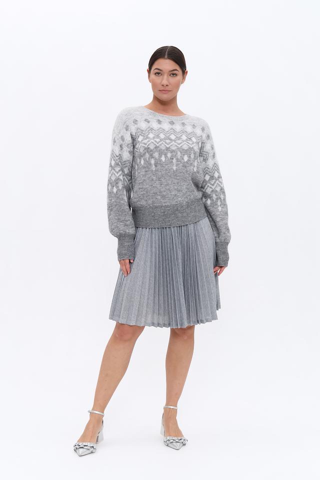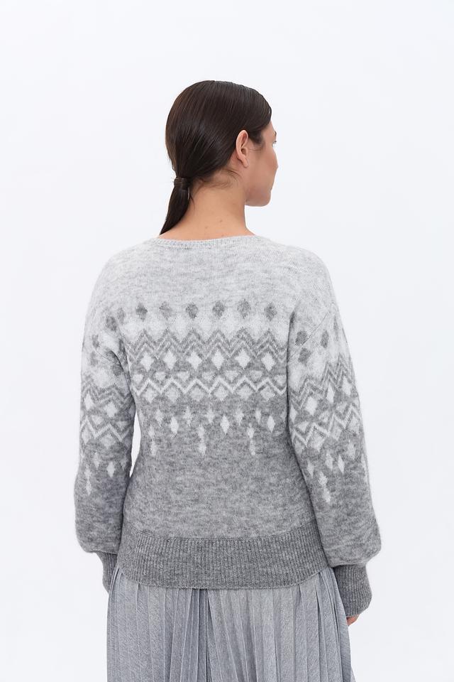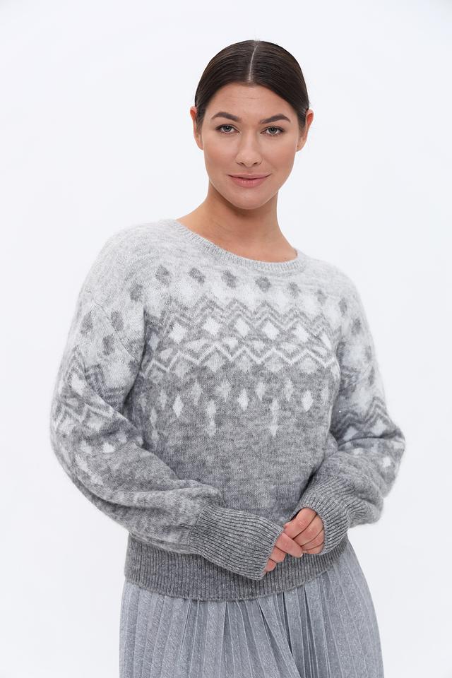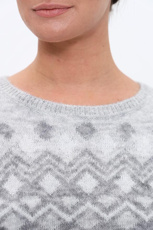 Серый пуловер Monari с жаккардовым узором – стильная и уютная модель для создания повседневных образов. Изготовлен из мягкой смеси шерсти и полиамида, обеспечивающей комфорт и тепло. Состав: полиамид 45%, полиакрил 22%, шерсть 16%, альпака 16%, метализ.полиэстер 1%