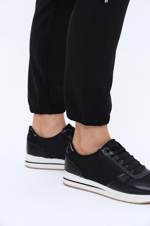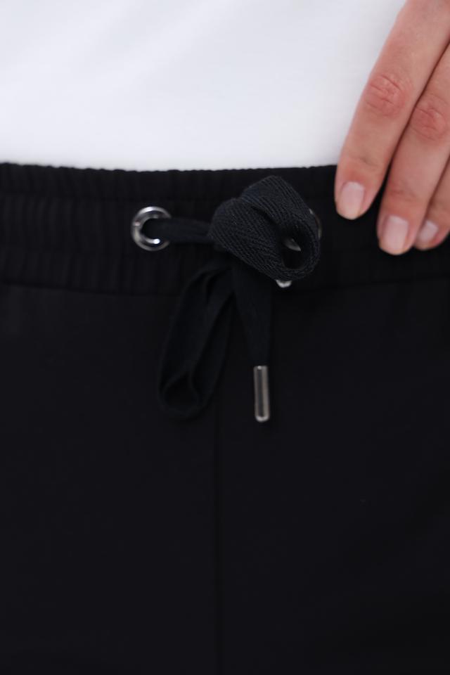 Чёрные брюки Monari — это стильное и комфортное решение для повседневного гардероба. Модель выполнена из мягкой ткани с добавлением эластана, имеет удобный пояс на шнуровке и декоративную полосу по бокам. Состав: полиэстер 89%, эластан 11%