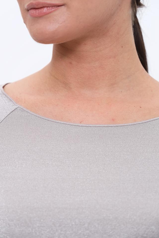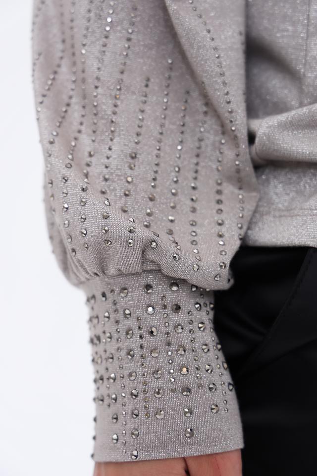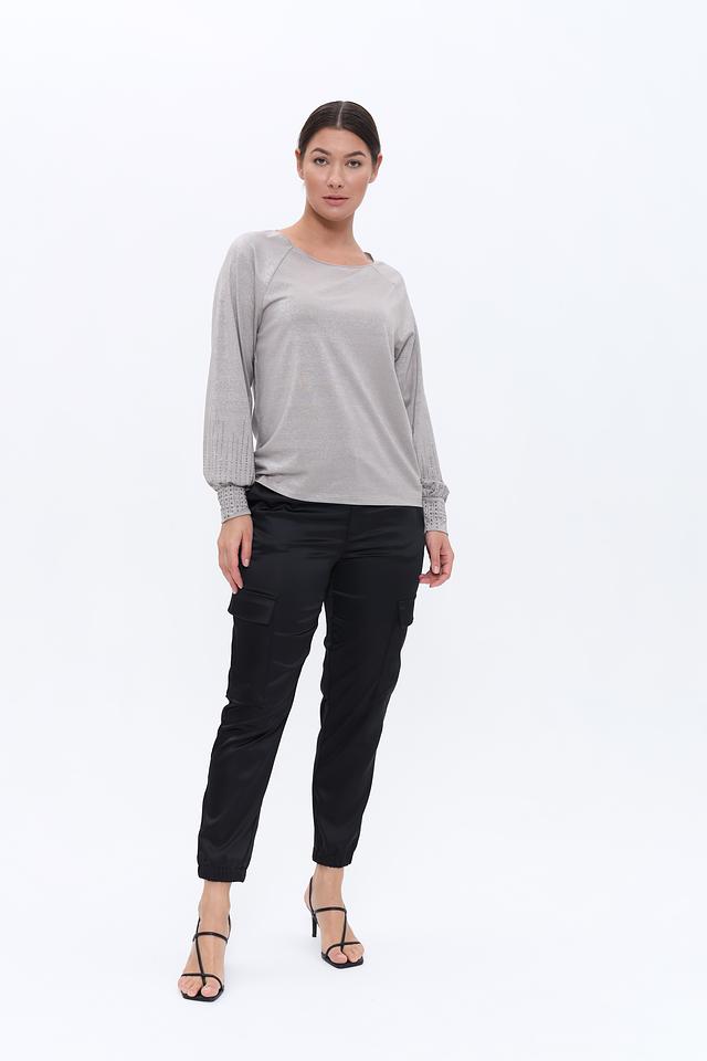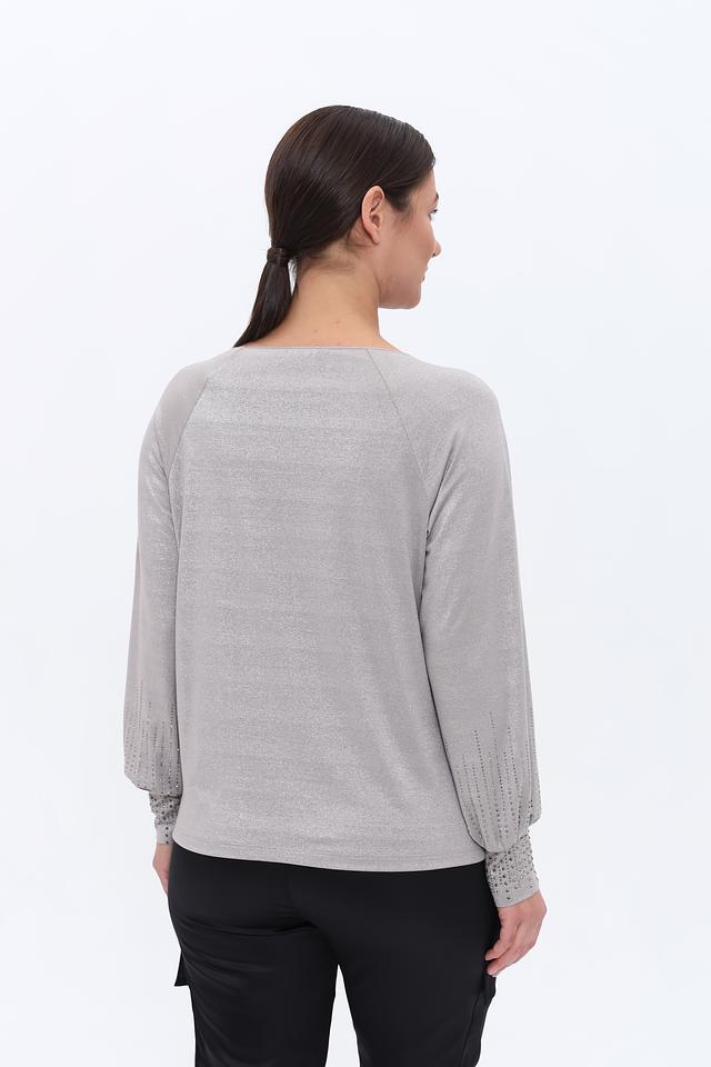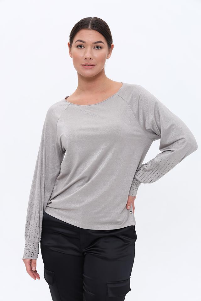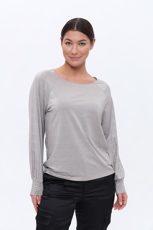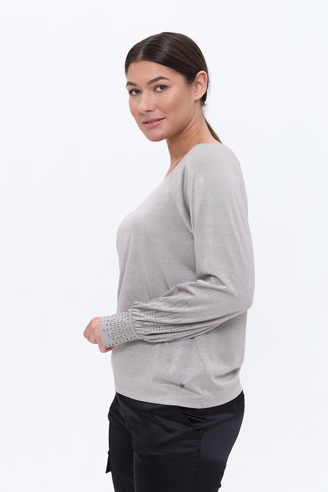 Стильная блуза Monari серого цвета с длинными рукавами, украшенными декоративной вышивкой. Изготовлена из мягкой ткани с добавлением металлизированных волокон, что придает ей легкий блеск и изысканность. Состав: полиэстер 49%, вискоза 26%, метализ.полиэстер 22%, эластан 3%
