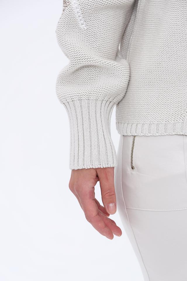 Пуловер изготовлен из высококачественного сочетания 50% хлопка и 50% полиакрила, что обеспечивает мягкость, комфорт и долговечность изделия. Текстура вязки приятна на ощупь и хорошо держит форму.