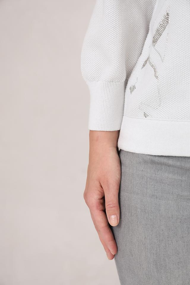 Модель имеет свободный крой и слегка спущенную линию плеч, что обеспечивает комфортную посадку. Рукава ¾ с небольшим буфом придают образу женственность и лёгкость. Пуловер изготовлен из высококачественного 100% хлопка, что делает его приятным к телу и обеспечивает отличную воздухопроницаемость.
