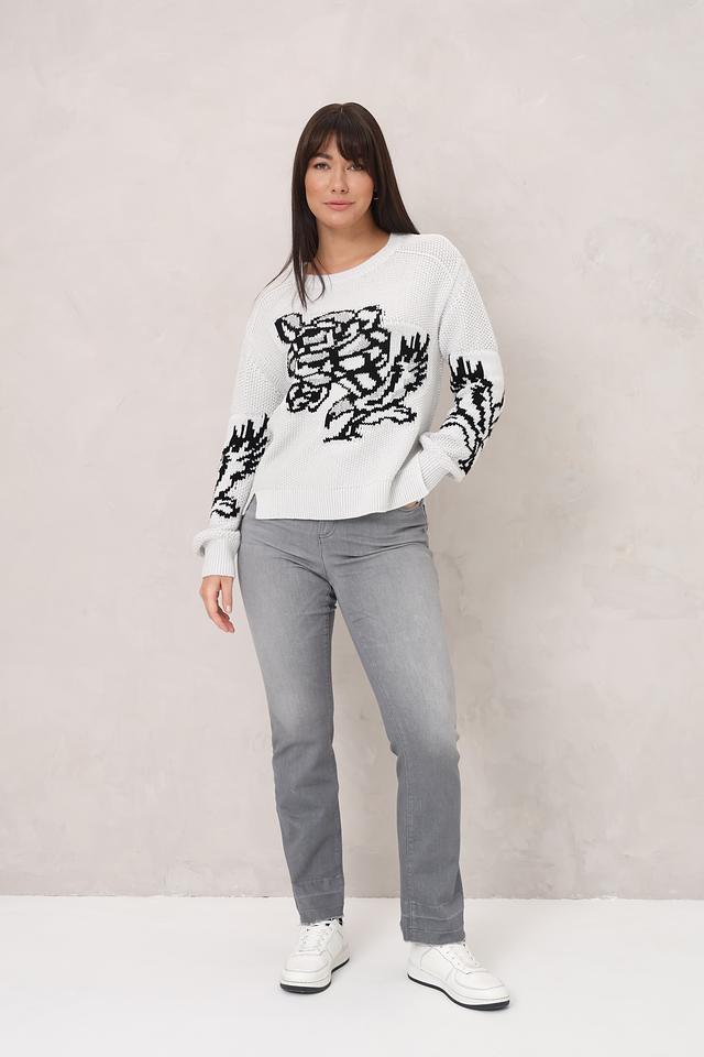 Этот стильный пуловер от Monari выполнен в белом цвете и украшен эффектным цветочным принтом. Модель имеет свободный крой и круглый вырез горловины, что обеспечивает комфортную посадку по фигуре.