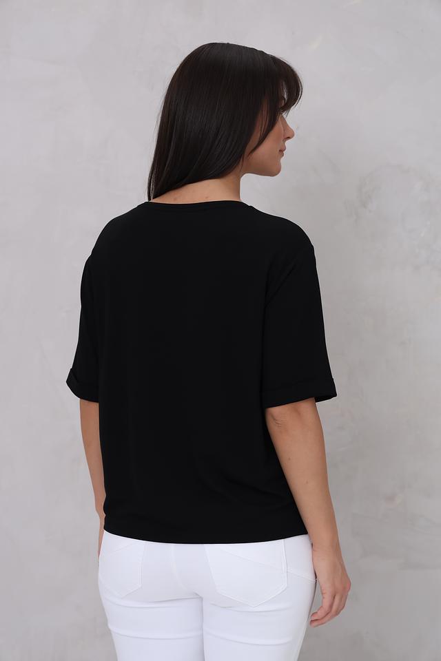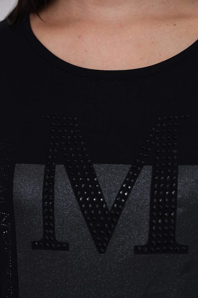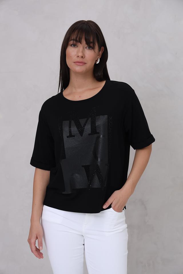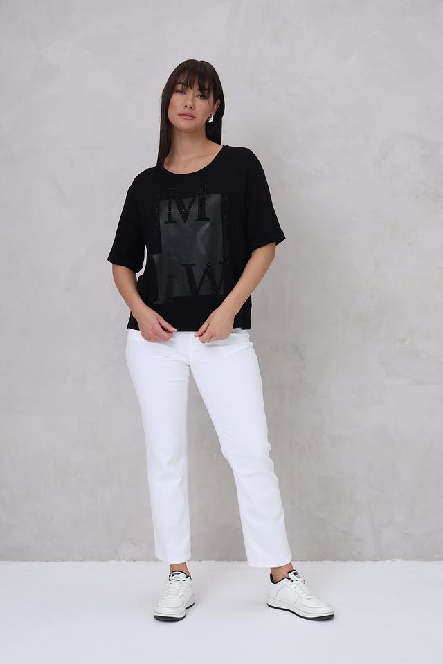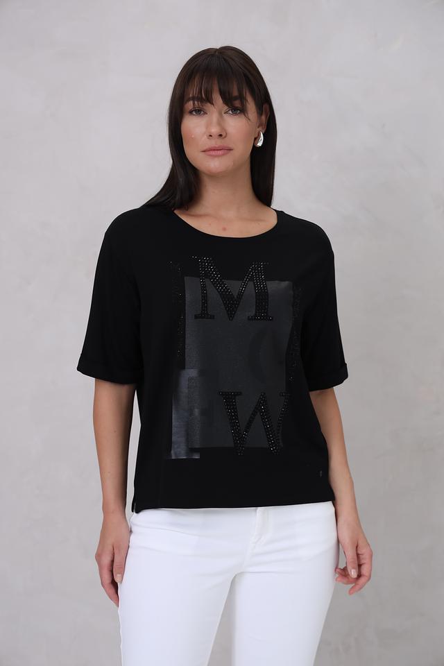 Чёрная футболка Monari с оригинальным дизайном. Модель свободного кроя украшена аппликацией с буквами "MW", инкрустированными стразами, что придает ей особый шарм и элегантность. Состав: вискоза 45%, модал 45%, эластан 10%
