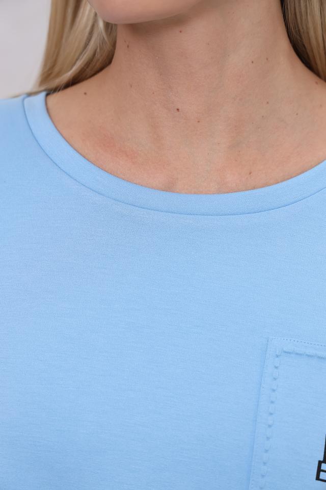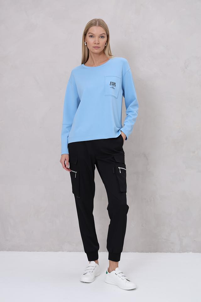 Женский пуловер Monari голубого цвета с накладным карманом на груди. Модель выполнена из мягкого трикотажа с добавлением вискозы и полиэстера, обеспечивающего комфорт и удобство в носке. Состав: вискоза 51%, полиэстер 43%, эластан 6%
