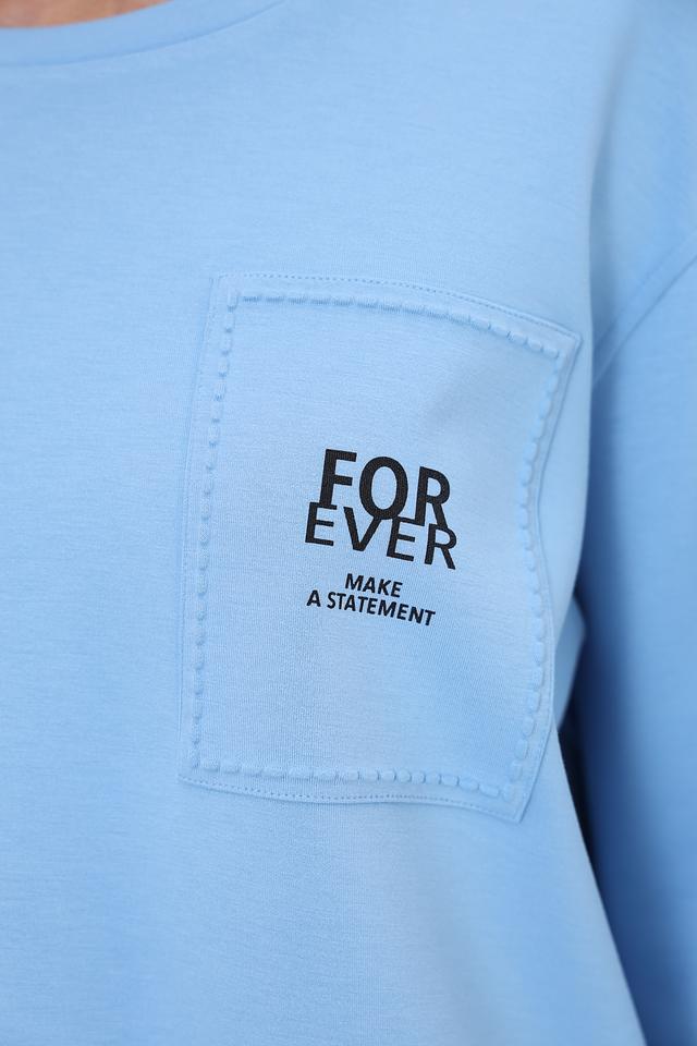 Передняя часть пуловера украшена накладным карманом с надписью "FOR EVER MAKE A STATEMENT", что придает ему оригинальность и индивидуальность. Круглый вырез горловины и длинные рукава делают этот пуловер универсальным для различных образов.